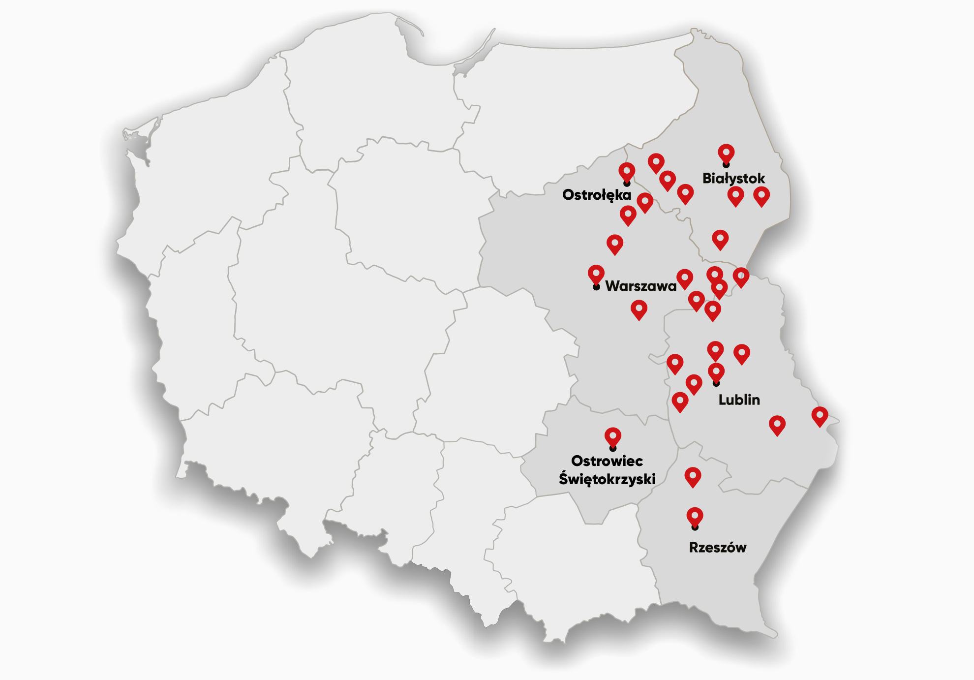 - 34 salony w województwach: Mazowieckie, Lubelskie, Podlaskie, Podkarpackie i Świętokrzyskie.