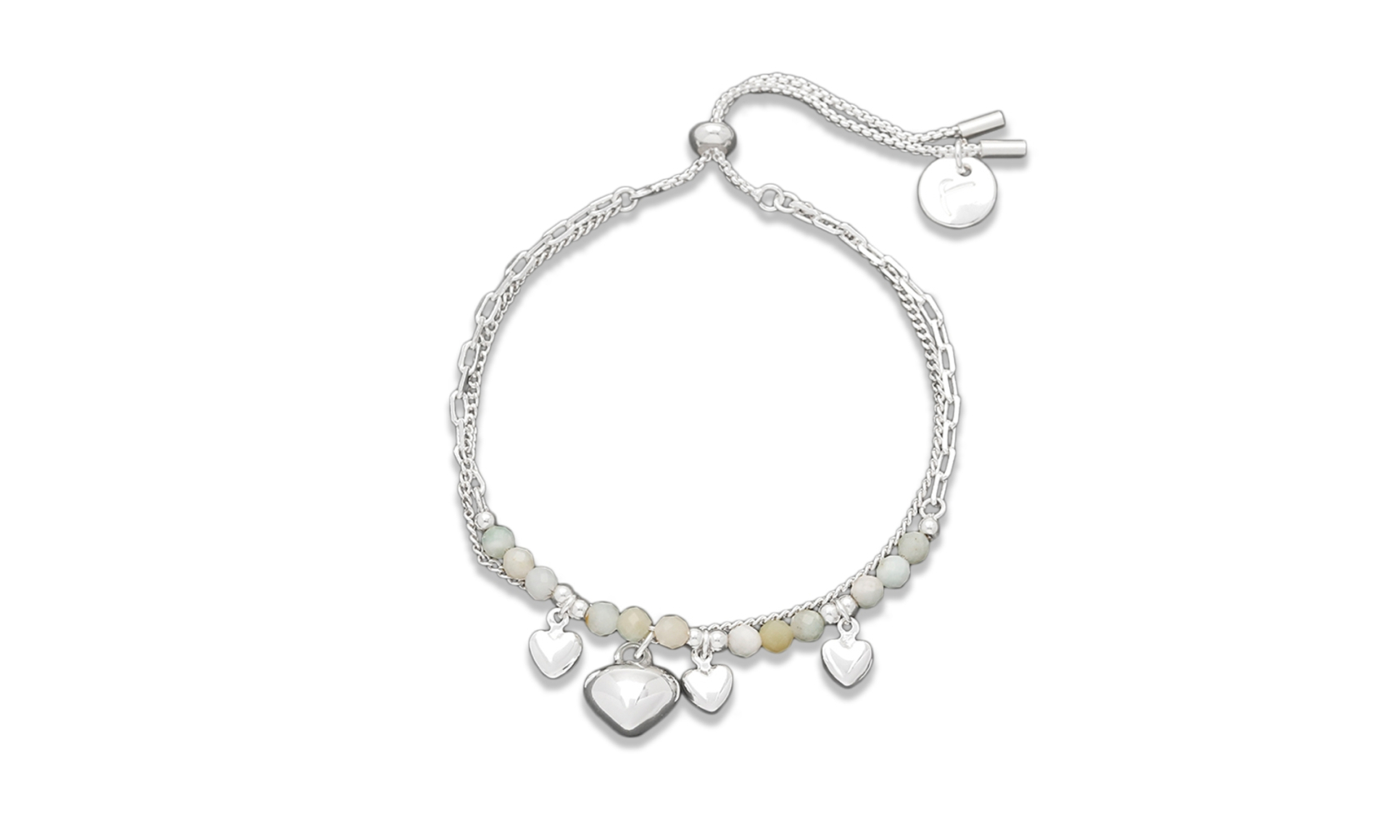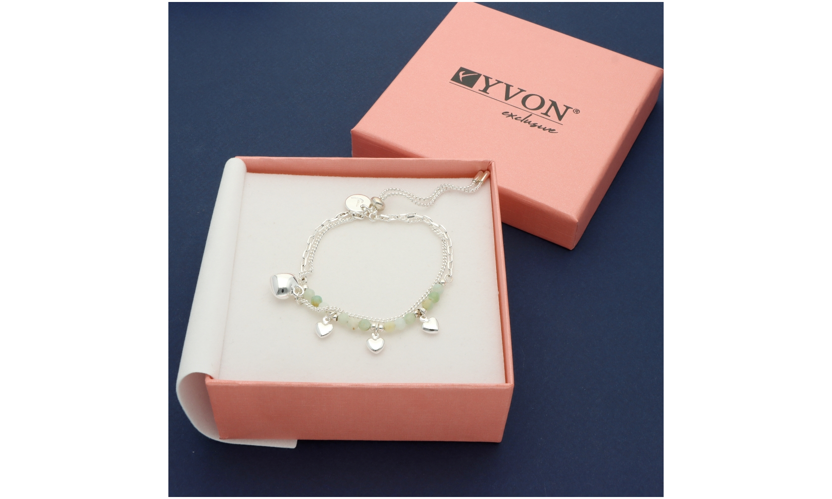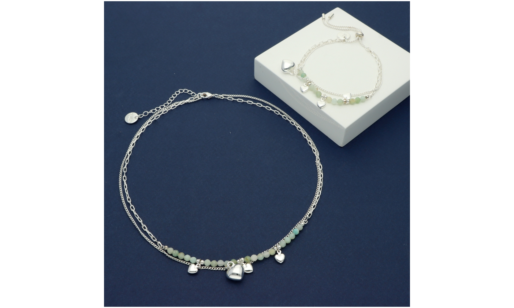 Bransoletka posrebrzana z amazonitami B00108 – dwuwarstwowa, regulowana, z zawieszkami w kształcie serca. Subtelny srebrny połysk i naturalny amazonit przynoszą harmonię i spokój.