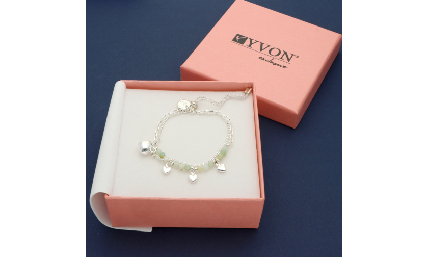 Bransoletka ma dwie warstwy, które tworzą subtelną i efektowną kompozycję. Pierwsza warstwa to delikatny łańcuszek o splocie pancerka, który nadaje lekkości i kobiecej finezji, natomiast druga warstwa składa się z łańcuszka ankier, koralików z amazonitu i zawieszek w kształcie serca, tworząc wyjątkowy, romantyczny akcent. Połączenie srebra z naturalnymi odcieniami amazonitu nadaje bransoletce delikatności i elegancji, a jej dwuwarstwowa konstrukcja sprawia, że przyciąga wzrok, pozostając subtelną i lekką w odbiorze.
