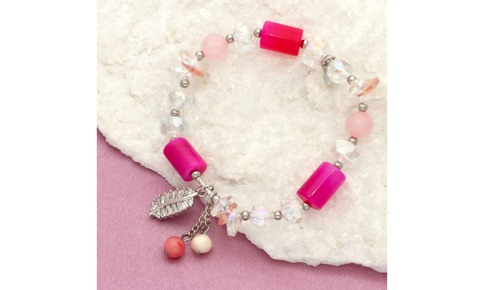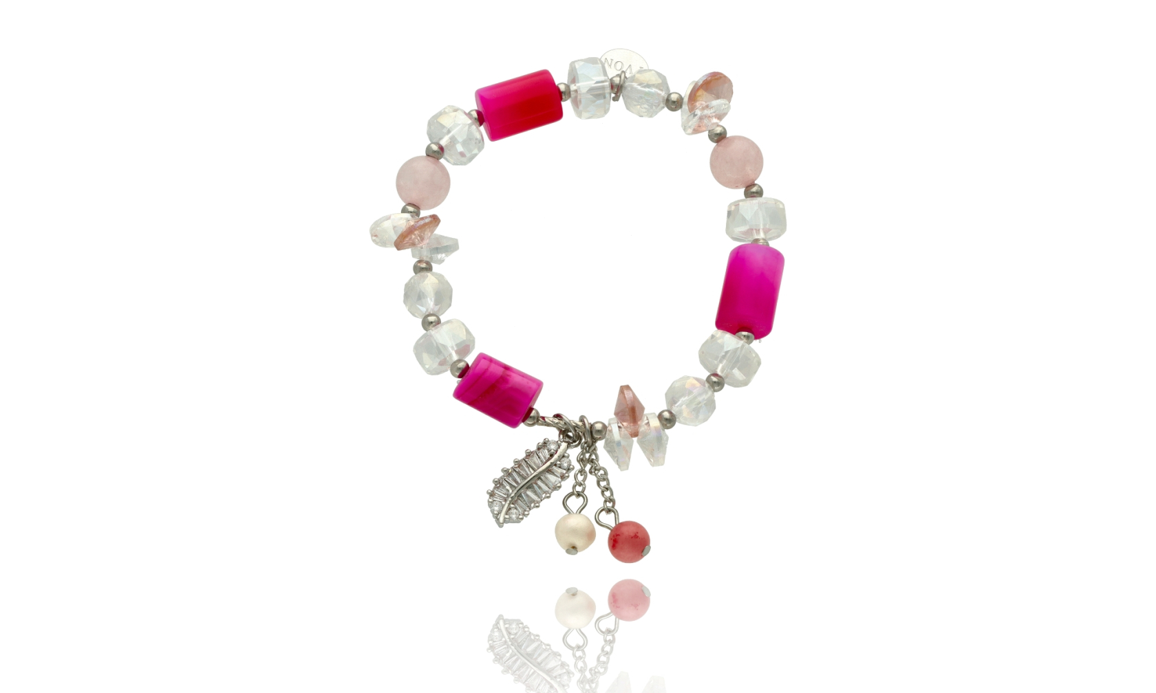 Bransoletka B96946 wykonana z naturalnych kamieni i antyalergicznego mosiądzu. Kryształ Górski i naturalny agat w odcieniach różu tworzą artystyczną i ozdobną damską biżuterię.