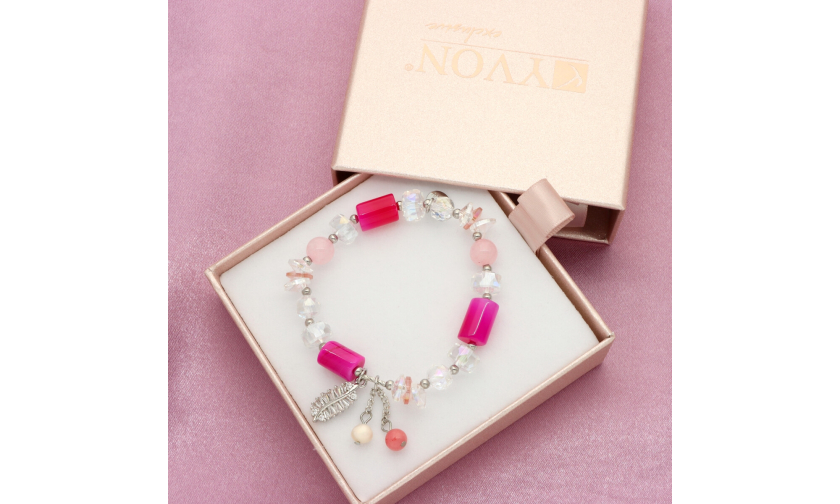 Bransoletka jest bez zapięcia, wykonana na elastycznym sznurku, co sprawia, że idealnie dopasowuje się do nadgarstka i jest wygodna w codziennym użytkowaniu. Metalowe elementy z mosiądzu w kolorze srebrnym subtelnie podkreślają naturalne odcienie kamieni, a ich połysk dodaje biżuterii luksusowego charakteru. Kompozycję tworzą koraliki różnej wielkości i ozdobne zawieszki, co nadaje bransoletce artystycznego i kobiecego wyglądu – jest to idealny dodatek zarówno na co dzień, jak i na wyjątkowe okazje.