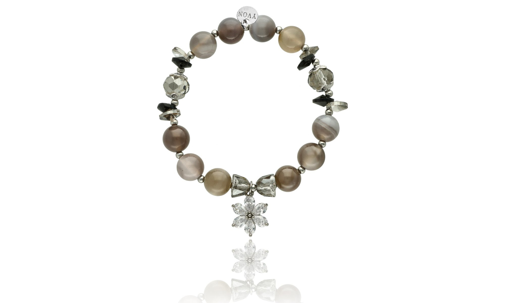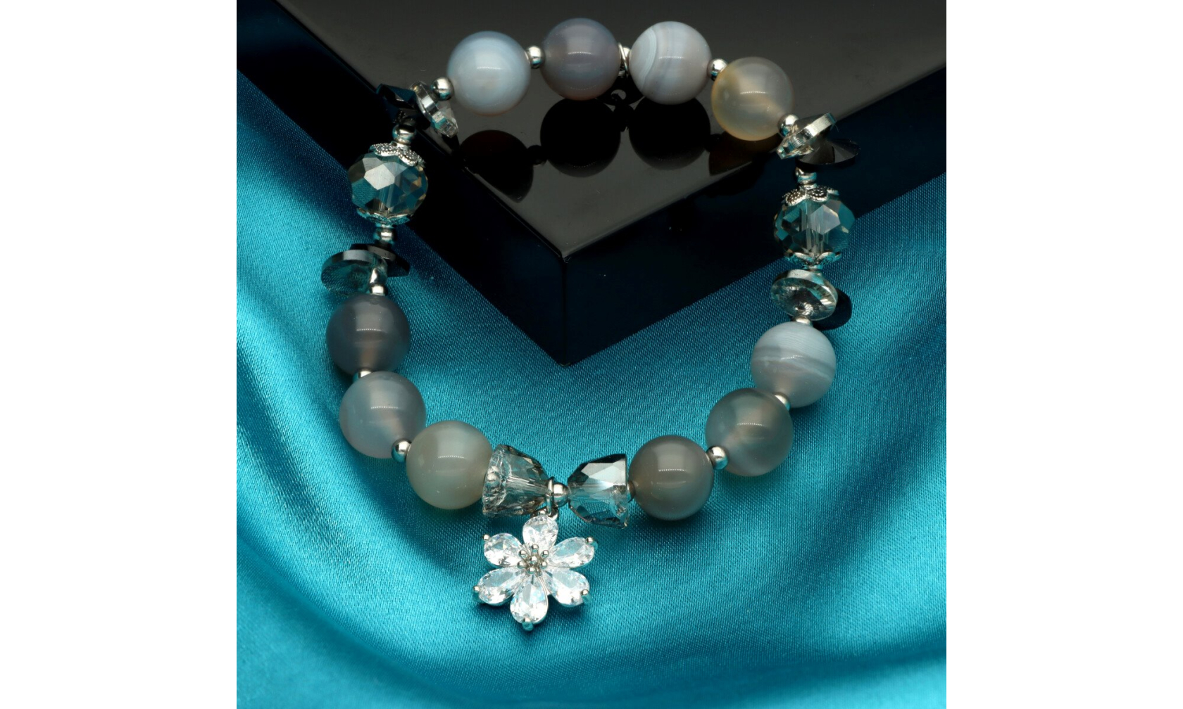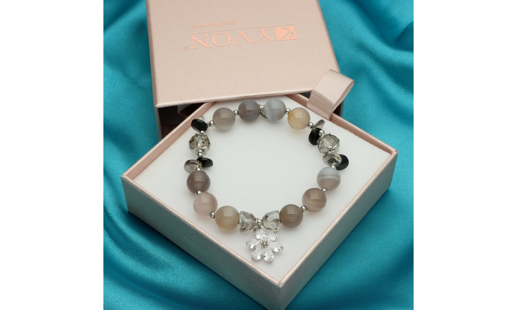 Bransoletka została zaprojektowana z myślą o kobietach, które cenią naturalny styl i ponadczasową elegancję. Jej kompozycję tworzą okrągłe agaty, ozdobne koraliki i połyskujące kryształy, zestawione z metalowymi elementami z srebrnego mosiądzu. Całość uzupełnia urocza zawieszka w kształcie kwiatka zdobiona cyrkoniami, która dodaje biżuterii delikatnego, romantycznego akcentu. To bransoletka, która przyciąga wzrok subtelnym blaskiem i wyjątkowym wyczuciem stylu.