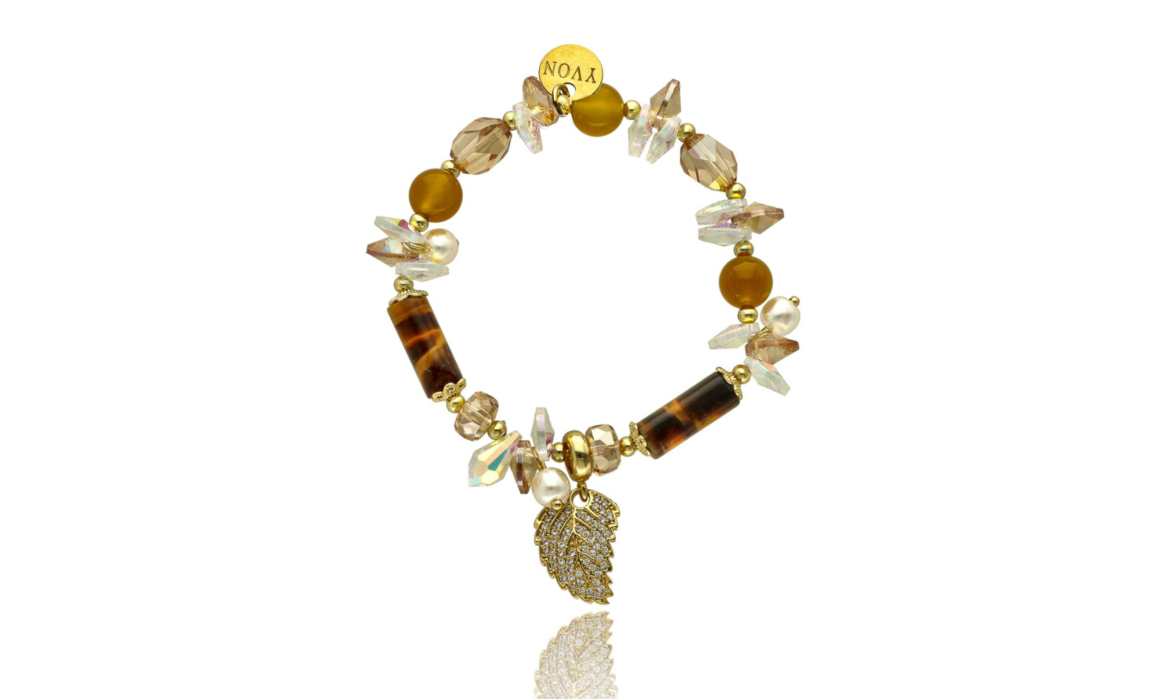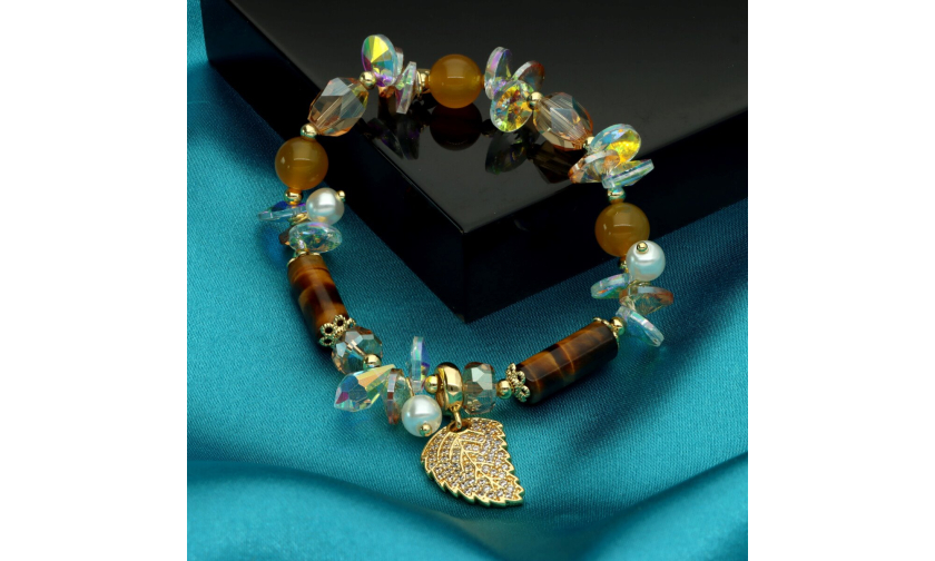 Każdy detal tej biżuterii został starannie zaprojektowany, aby łączyć luksusowy wygląd z energią natury. Bransoletka składa się z ozdobnych koralików o różnych kształtach i rozmiarach, które tworzą artystyczną, harmonijną kompozycję w odcieniach złota, brązu, perły i przejrzystego kryształu. Całość dopełniają pozłacane elementy z mosiądzu oraz zawieszka w kształcie listka, ozdobiona drobnymi kryształkami, nadająca biżuterii wyjątkowego, kobiecego uroku.