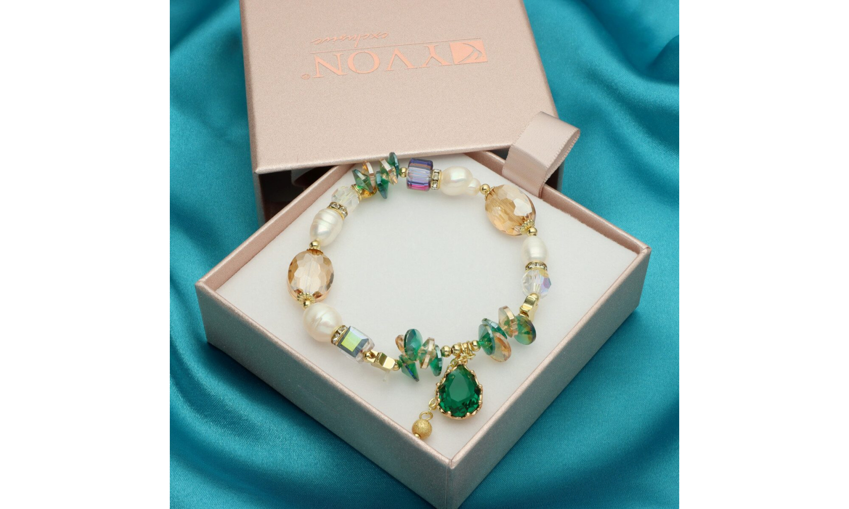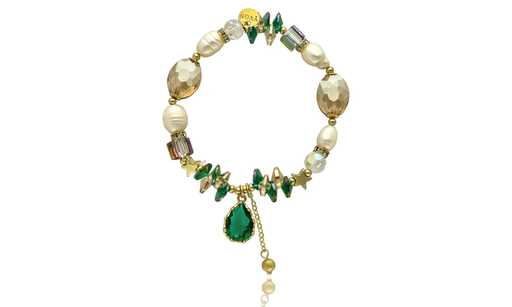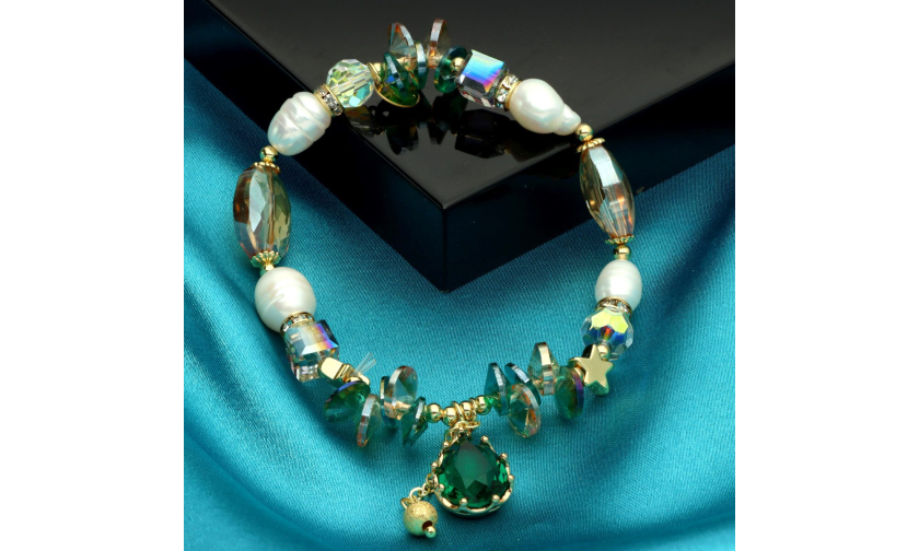 Bransoletka składa się z ozdobnych koralików różnej wielkości i kształtu – lśniących pereł, błyszczących kryształków i złotych akcentów. To niebanalne zestawienie tworzy artystyczną, kobiecą kompozycję utrzymaną w odcieniach zieleni, złota, perłowej bieli i przezroczystego kryształu, który pięknie odbija światło. Efekt jest delikatny, a zarazem wyrazisty – bransoletka idealnie dopełni zarówno elegancką stylizację wieczorową, jak i codzienny, subtelny look.