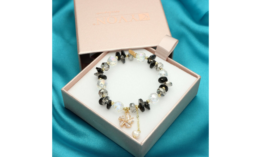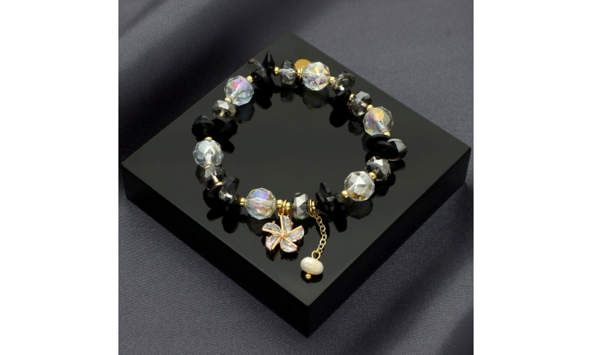 Bransoletka utrzymana jest w stylu glamour z nutą nowoczesności, a jej design łączy w sobie lekkość i wyrafinowanie. Zestawienie złota, czerni i przejrzystego kryształu tworzy elegancką i uniwersalną kompozycję, która sprawdzi się w każdej sytuacji – od codziennych stylizacji po wieczorowe wyjścia.