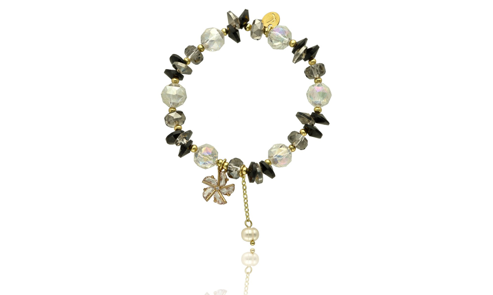 Bransoletka składa się z ozdobnych koralików o różnych kształtach i wielkościach, dzięki czemu każdy egzemplarz ma niepowtarzalny charakter. Kamienie o transparentnych i szarawych odcieniach doskonale komponują się ze złotymi elementami z mosiądzu, tworząc elegancką, zrównoważoną kolorystykę. Całość dopełnia zawieszka w kształcie kwiatka oraz subtelna perła osadzona na delikatnym łańcuszku, która dodaje całości klasy i kobiecego uroku.