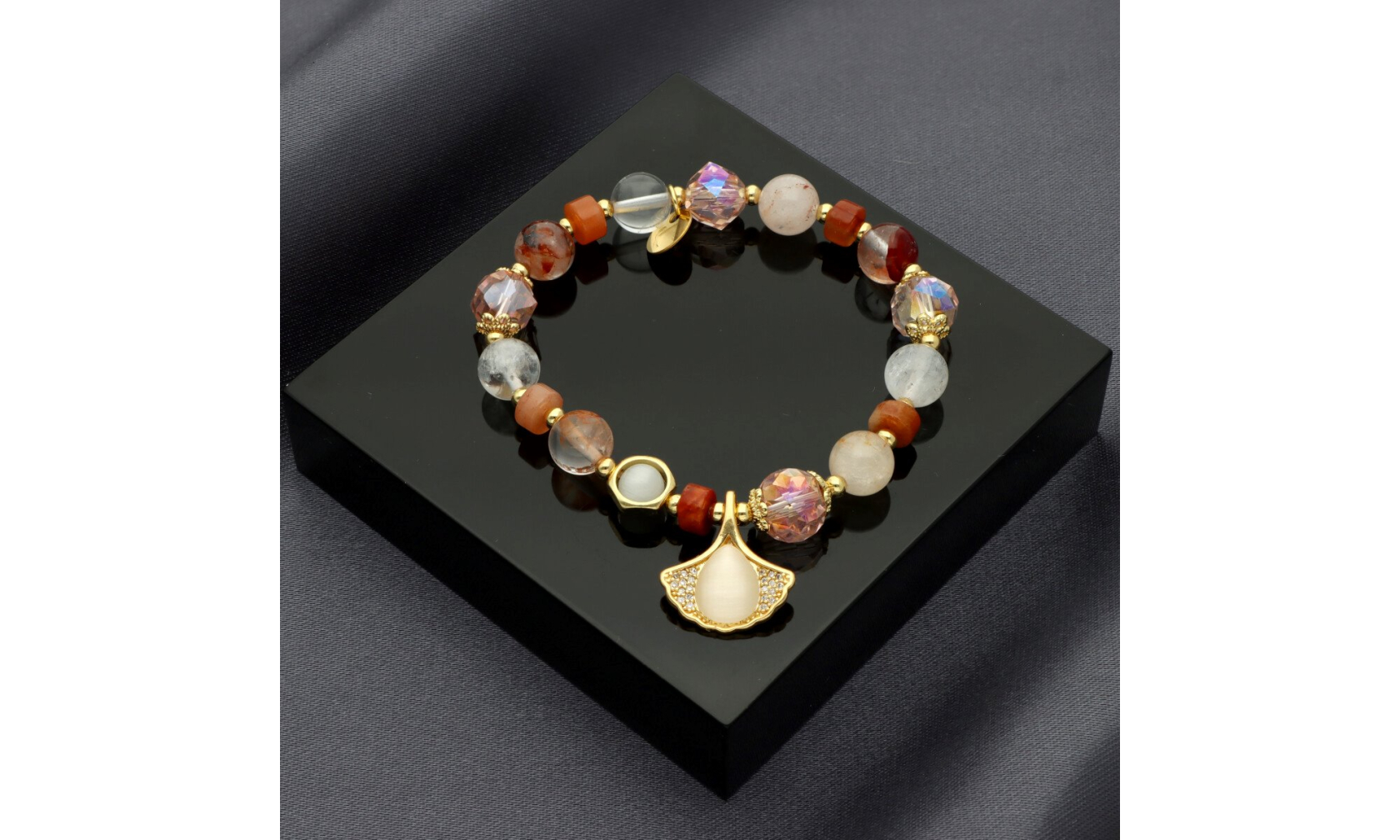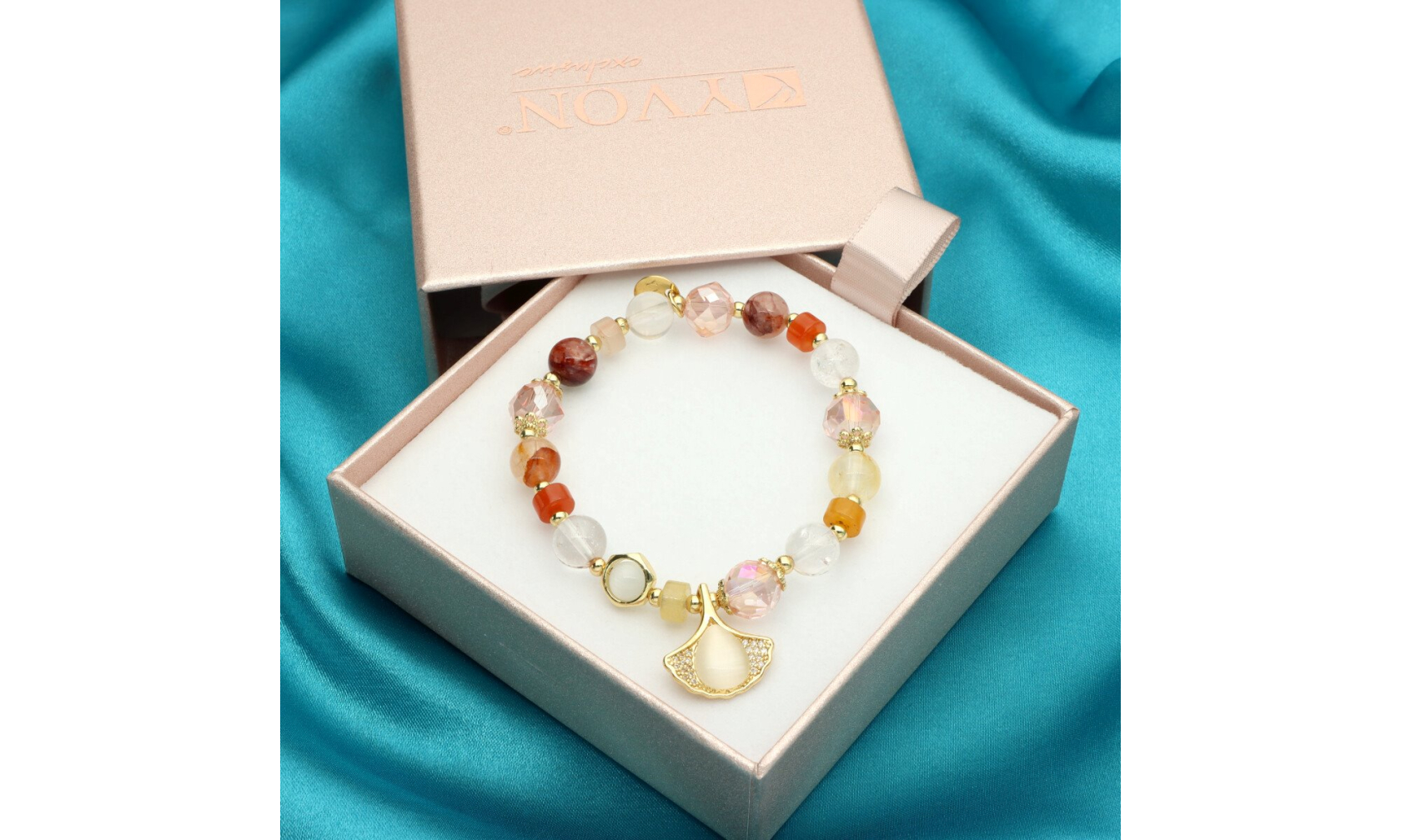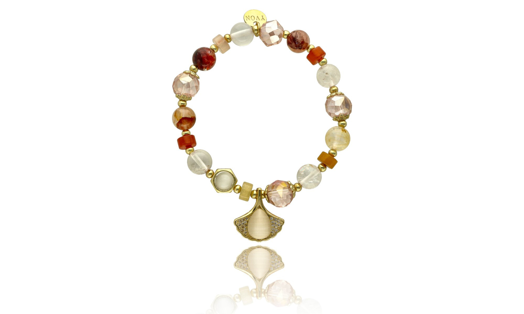 Złote elementy z mosiądzu nadają całości ciepłego blasku i szlachetności. Bransoletkę uzupełnia ozdobna zawieszka w kształcie liścia miłorzębu – symbolu długowieczności, równowagi i odporności. Jego delikatna forma i złoty połysk sprawiają, że bransoletka prezentuje się niezwykle kobieco i zmysłowo.