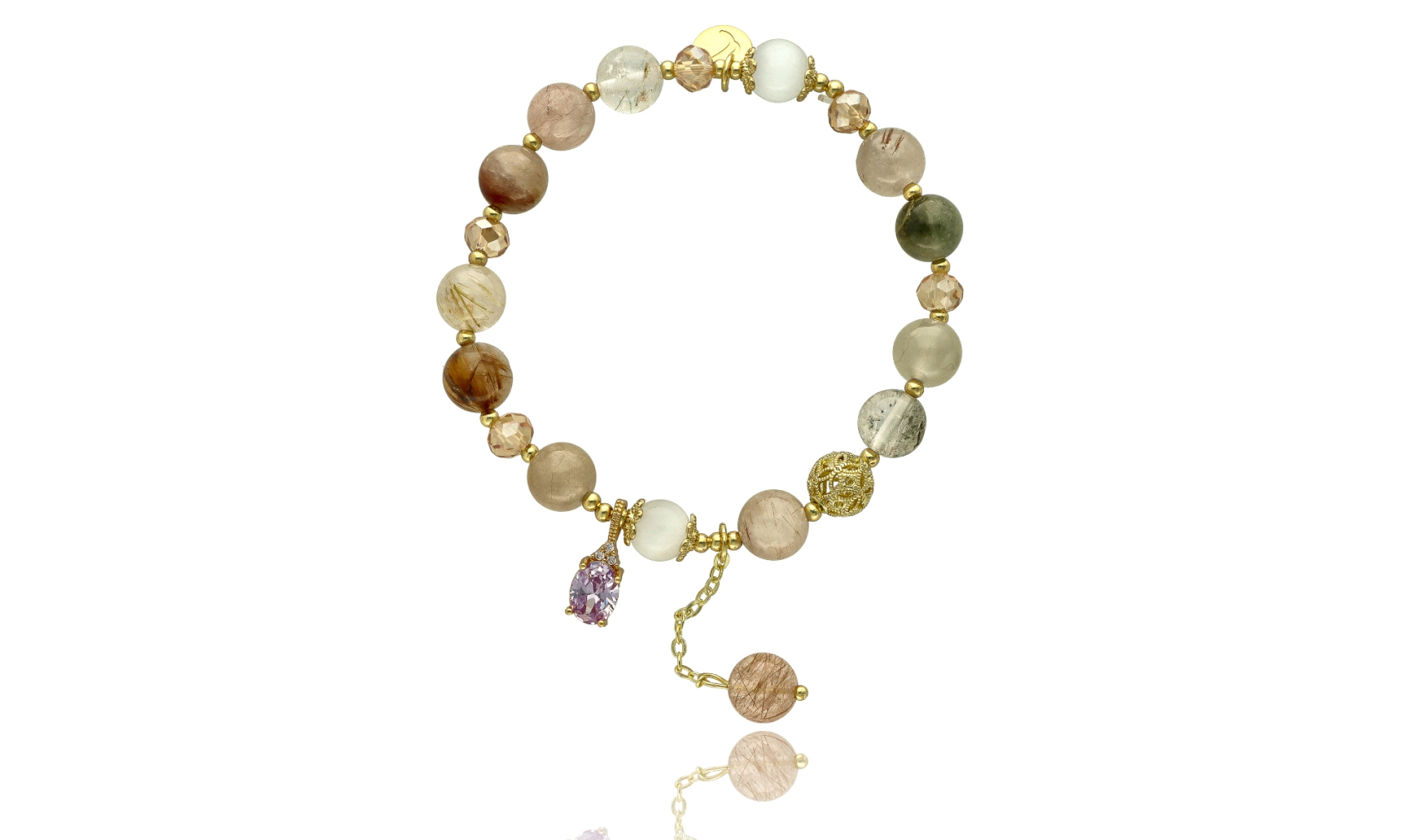 Poznaj wyjątkową biżuterię, która łączy elegancję z energią natury. Damska bransoletka B96993 z kolekcji LOVELY STONES to dzieło sztuki jubilerskiej, w którym każdy detal został dopracowany z najwyższą starannością. Wykonana z pozłacanego mosiądzu oraz ozdobiona kamieniami naturalnymi: kwarcem rutylowym, kwarcem Cat Eye i kryształem górskim, zachwyca swoją subtelnością i niepowtarzalnym blaskiem.