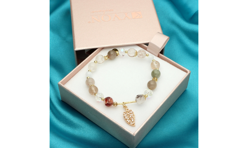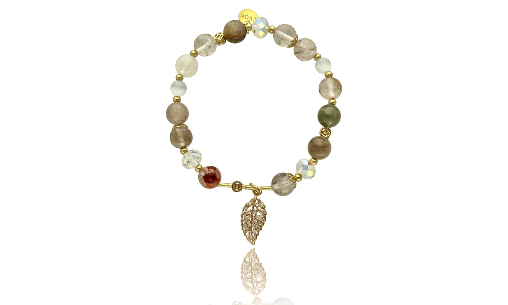Każdy element tej bransoletki został zaprojektowany z dbałością o detale. Kompozycja różnorodnych koralików o unikalnych kształtach i rozmiarach tworzy harmonijną całość, podkreśloną delikatnym połyskiem złotych akcentów. Urokliwa zawieszka w kształcie listka dodaje biżuterii lekkości i romantycznego wdzięku, przywodząc na myśl bliskość natury i energię życia. Bransoletka utrzymana jest w ciepłych tonacjach złota i beżu, które pięknie współgrają z każdym typem urody i pasują zarówno do codziennych, jak i wieczorowych stylizacji.