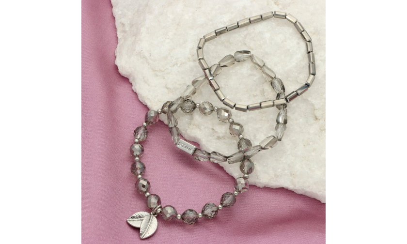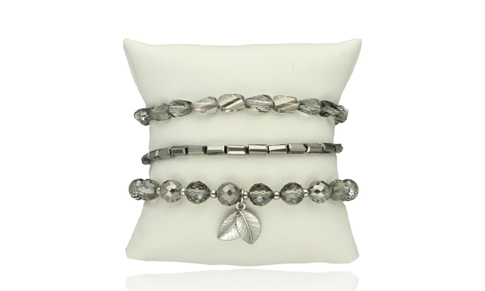 Komplet trzech eleganckich bransoletek B97895 w odcieniach srebra i szarości. Antyalergiczne biżuteria z mosiądzu i szkła, wykonana z dbałością o każdy szczegół.