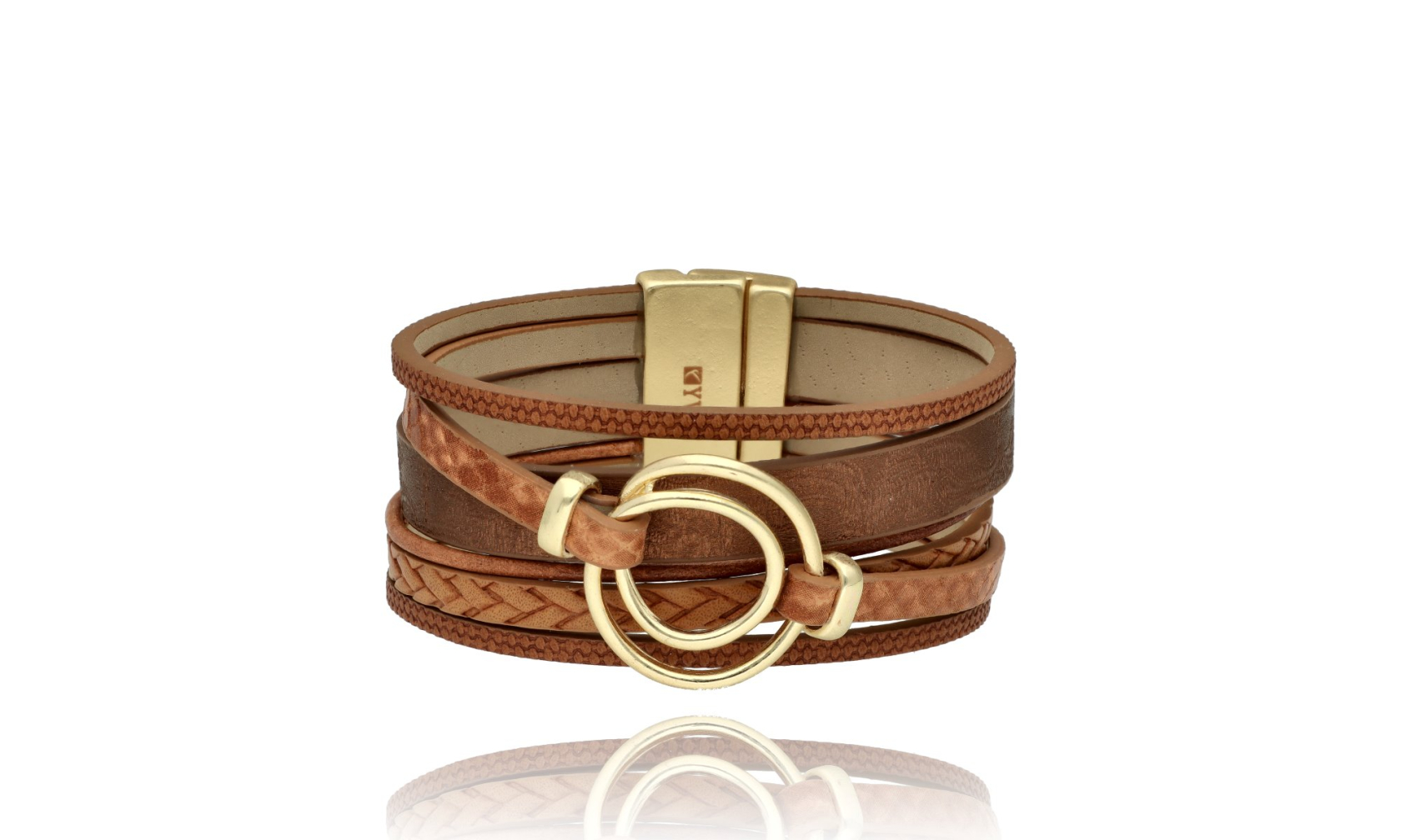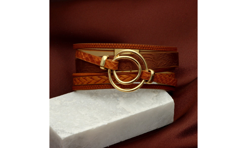 Wykonana z naturalnej i ekologicznej skóry, bransoletka zachwyca miękkością, trwałością i komfortem noszenia. Każdy z kilku rzemyków o różnej grubości i fakturze tworzy harmonijną kompozycję w ciepłych odcieniach brązu, która pięknie współgra z kobiecą urodą i dodaje stylizacji głębi. Z przodu bransoletki umieszczono ozdobny metalowy element – subtelny akcent, który przyciąga wzrok i nadaje całości wyrafinowanego charakteru.