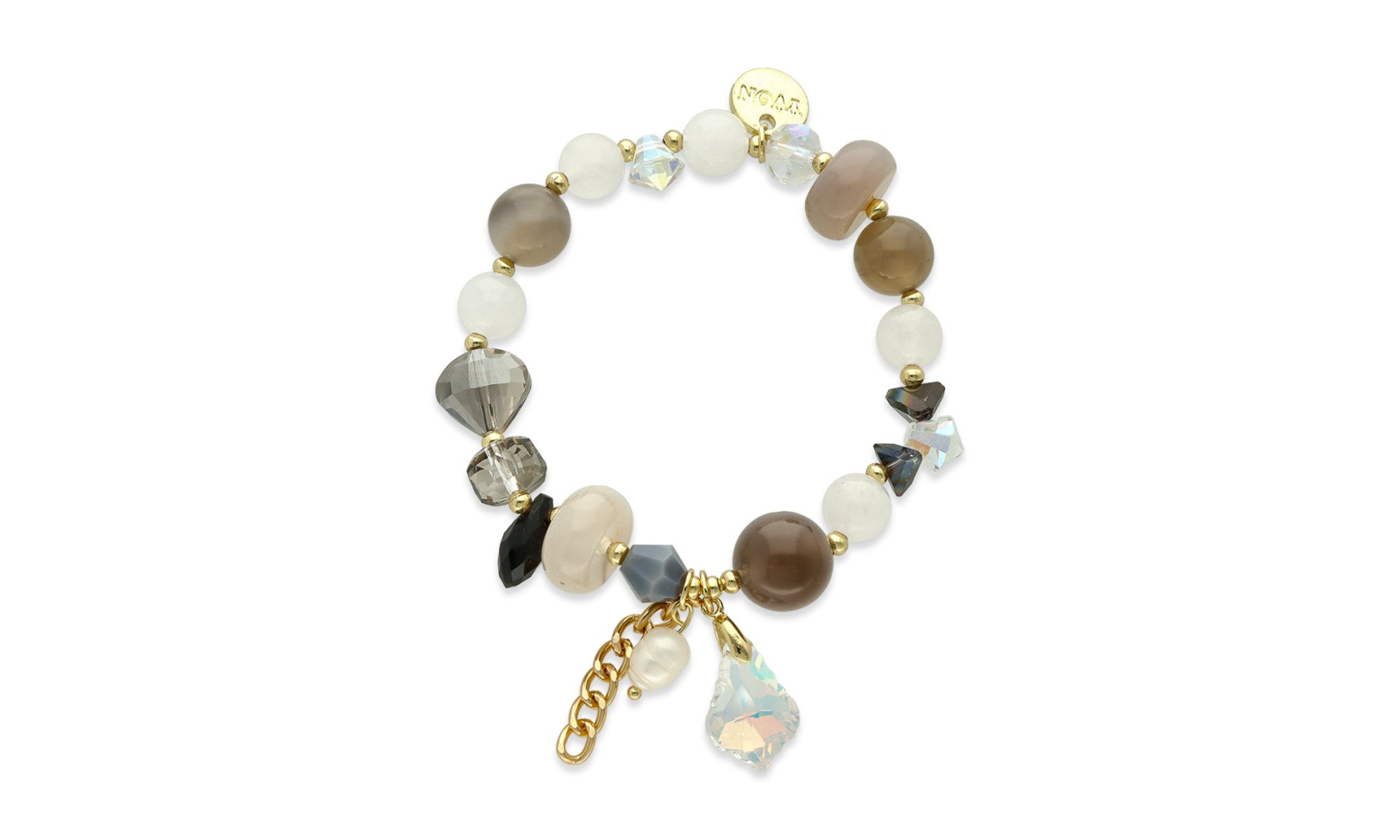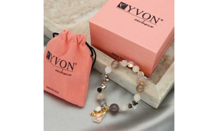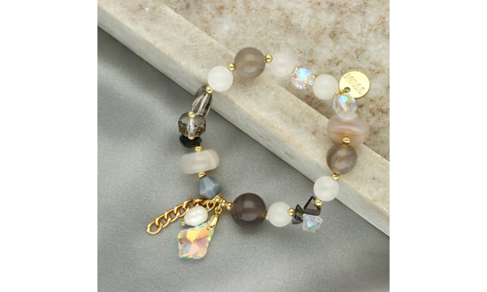 Kolorystyka bransoletki obejmuje złoto, biel, szarość i zgaszony brąz, co pozwala na łatwe dopasowanie jej do różnorodnych stylizacji – zarówno codziennych, jak i wieczorowych. Bransoletka jest uniwersalna, nie posiada zapięcia i wykonana jest na elastycznym sznurku, co zapewnia komfort noszenia.