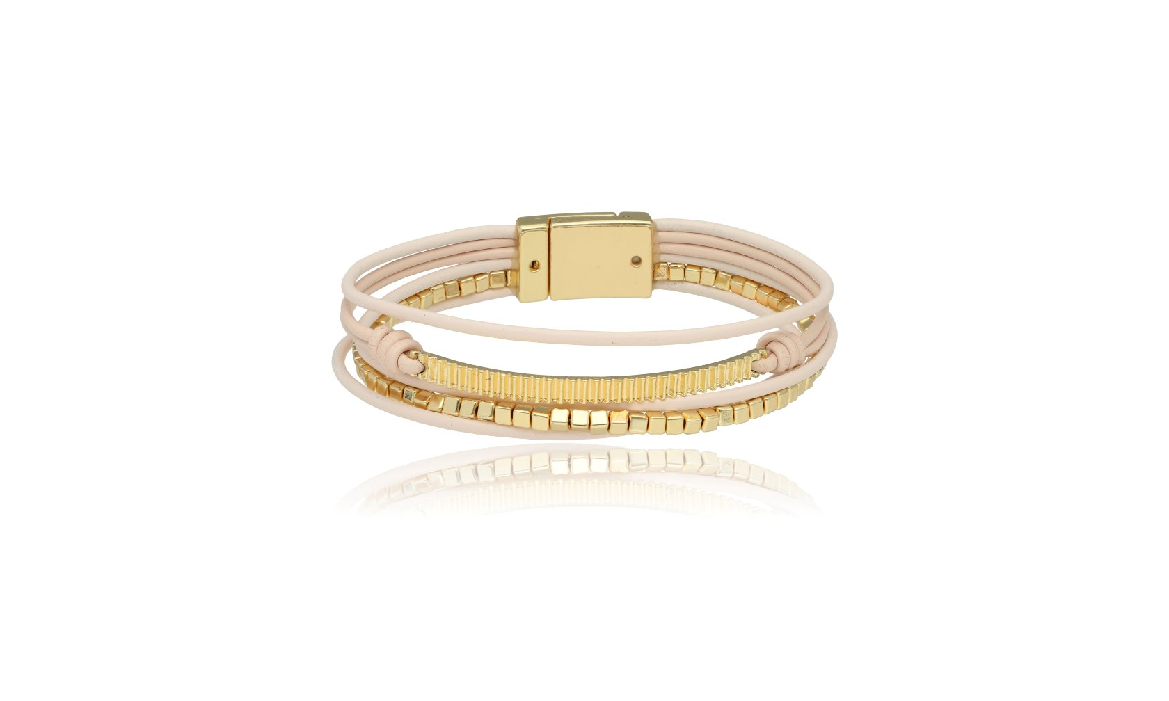 Bransoletka została wykonana z najwyższej jakości materiałów, w tym: naturalnej skóry, platerowanego akrylu oraz antyalergicznego metalu w złotym odcieniu. Cztery okrągłe rzemienie skórzane są subtelnie zdobione ząbkowaną blaszką i rzędem akrylowych, platerowanych kosteczek, które nadają bransoletce niepowtarzalny i luksusowy wygląd. Elementy metalowe są w pełni antyalergiczne, co gwarantuje komfort noszenia nawet dla osób o wrażliwej skórze.