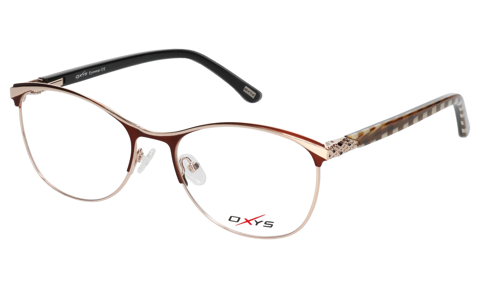 Oprawki damskie OXYS TP 4018 c.1 o lekko zaokrąglonym kształcie świetnie komponują się z twarzami trójkątnymi i prostokątnymi, łagodząc wyraziste rysy. Modny odcień brązu i zdobione zauszniki świetnie uzupełnią niejedną stylizację.