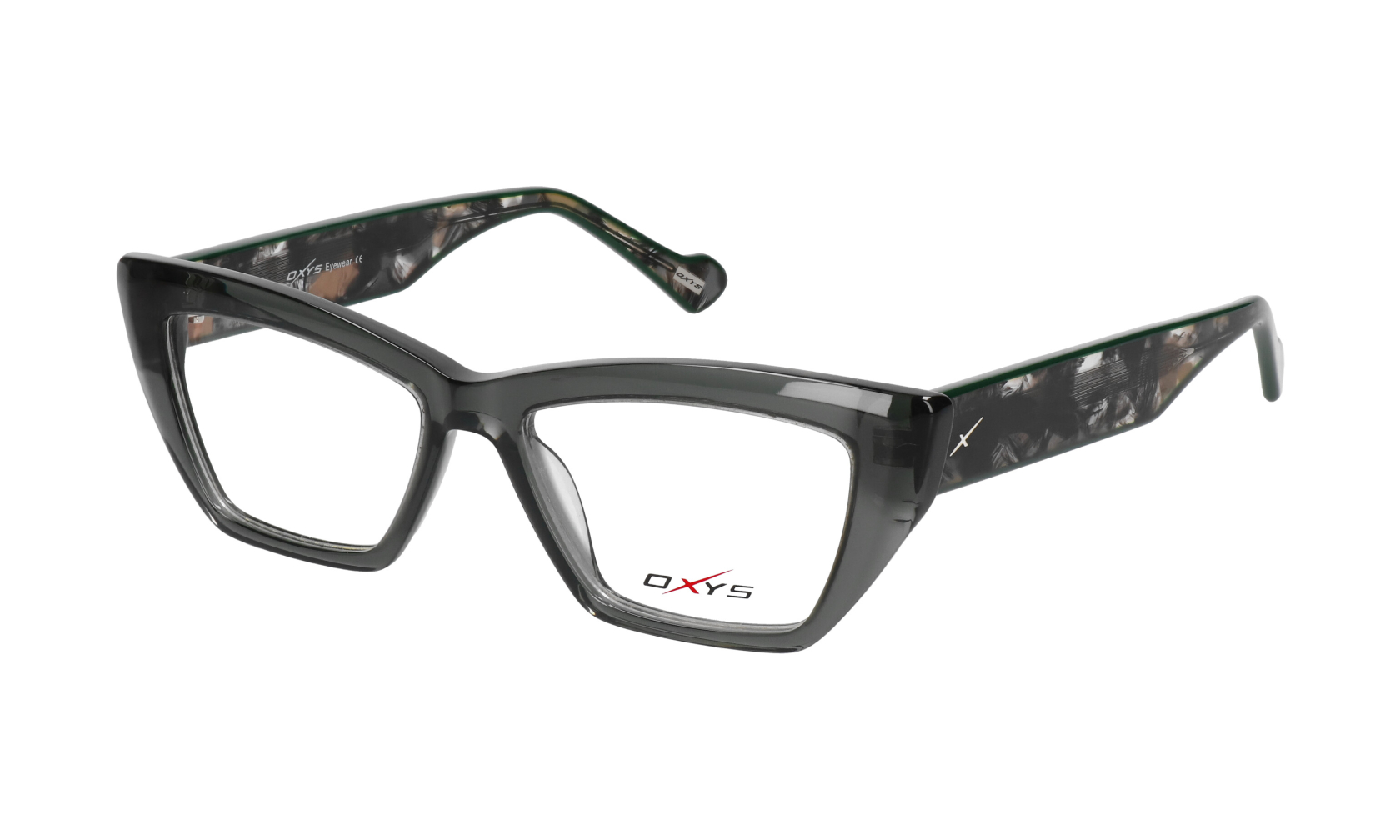 OXYS TP 5009 c.4 to nowoczesne damskie oprawki o awangardowym designie i prostokątnym kształcie. Transparentna czarna ramka z szerokimi ozdobnymi zausznikami nadaje elegancji i podkreśla unikalny styl.