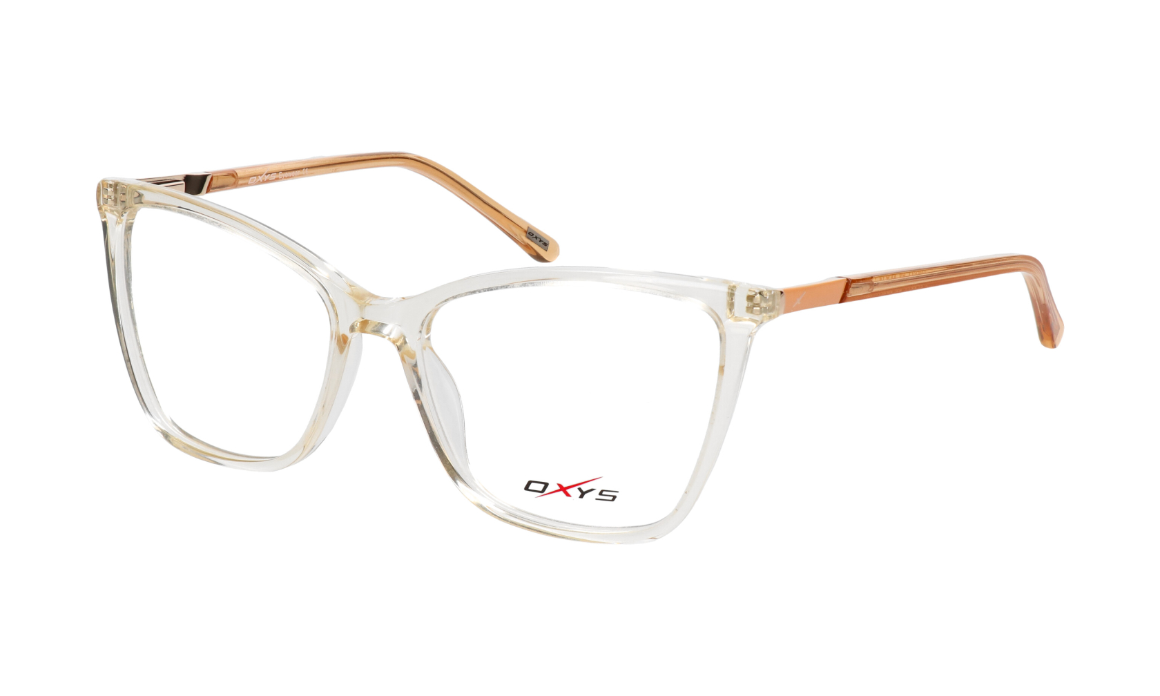 Damska oprawka korekcyjna OXYS TP 5014 c.6 wyróżnia się przezroczystym frontem i minimalistycznymi zausznikami. Bardzo twarzowe okulary w kształcie kociego oka z dużymi soczewkami.