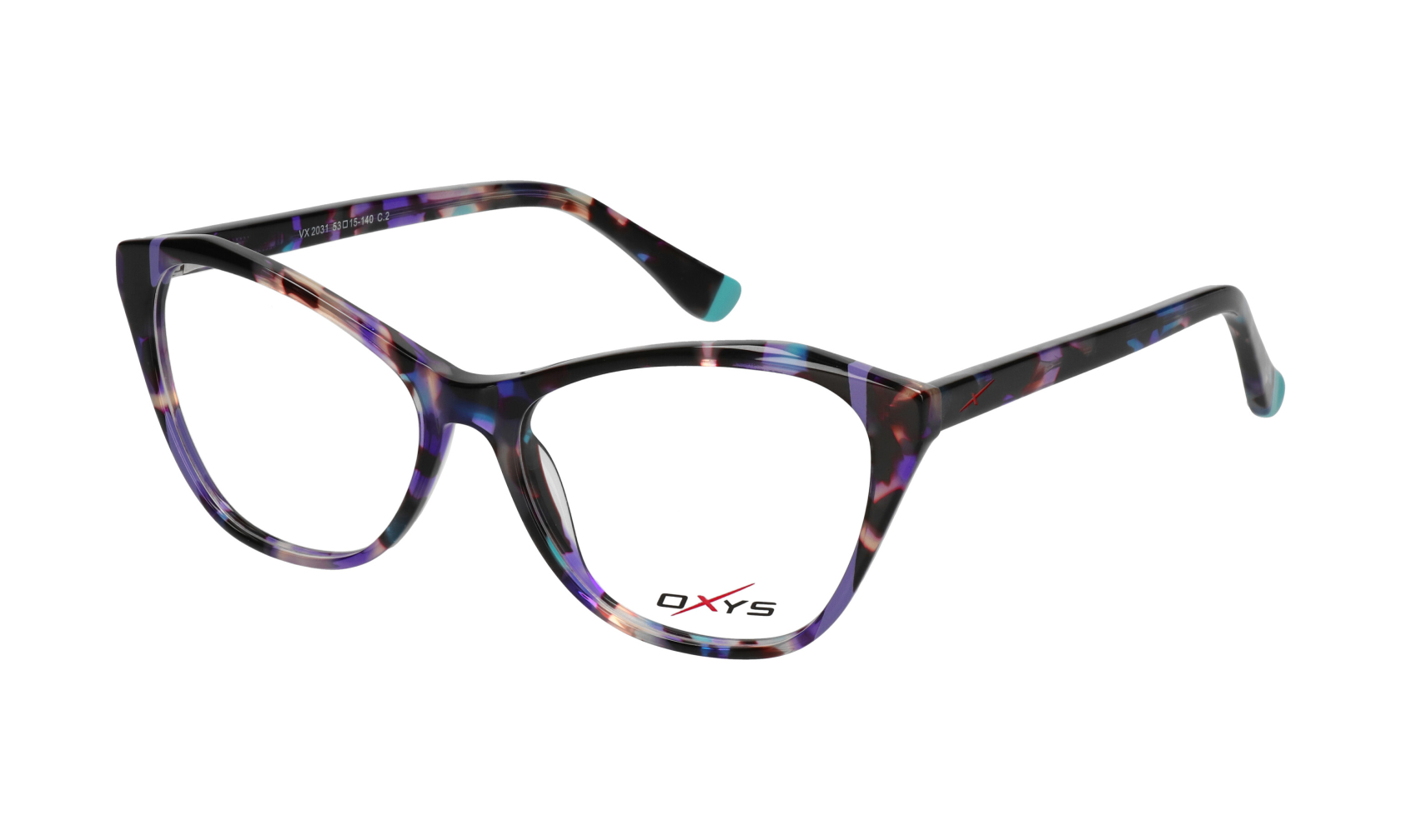 Damska oprawka korekcyjna OXYS VX 2031 c.2 o kształcie kocie oko i bogatej kolorystyce w odcieniach fioletu, turkusu i czerni.