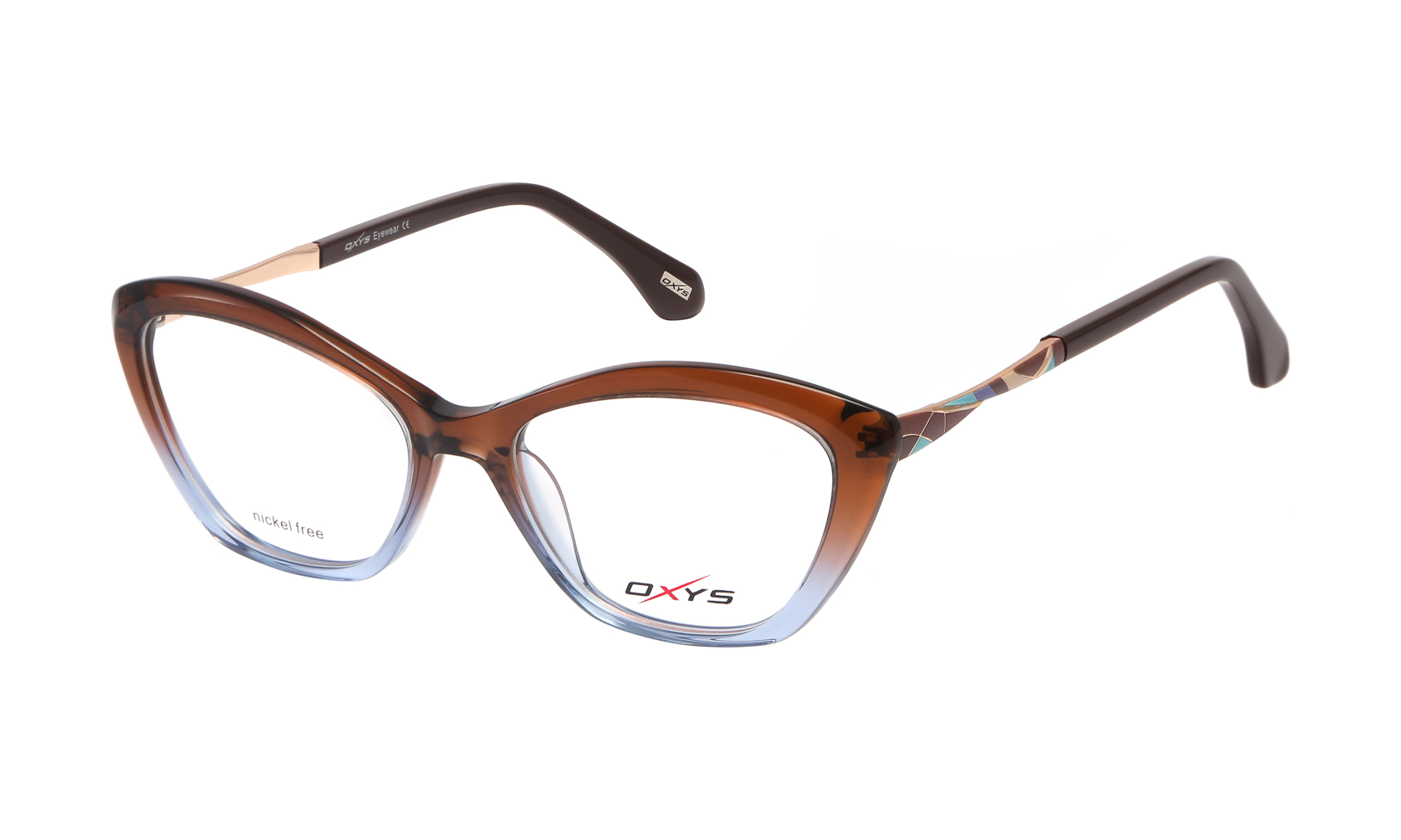 OXYS TP 5034 c.5 to stylowa oprawka w kształcie kocich oczu, wyróżniająca się subtelnymi ozdobami i delikatną kolorystyką. Wykonana z metalu Nickel Free, idealnie łączy estetykę z wygodą.