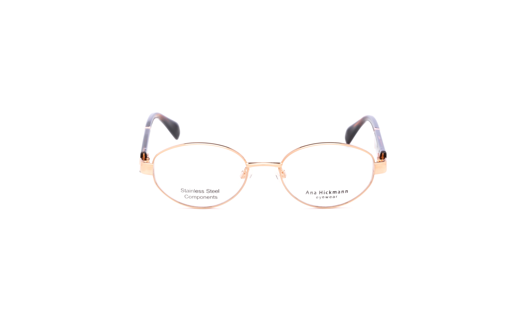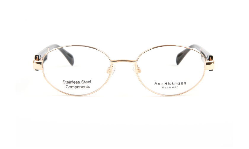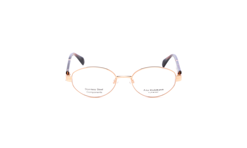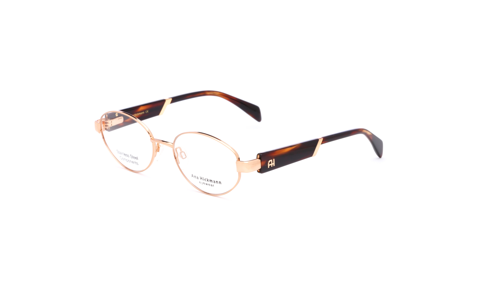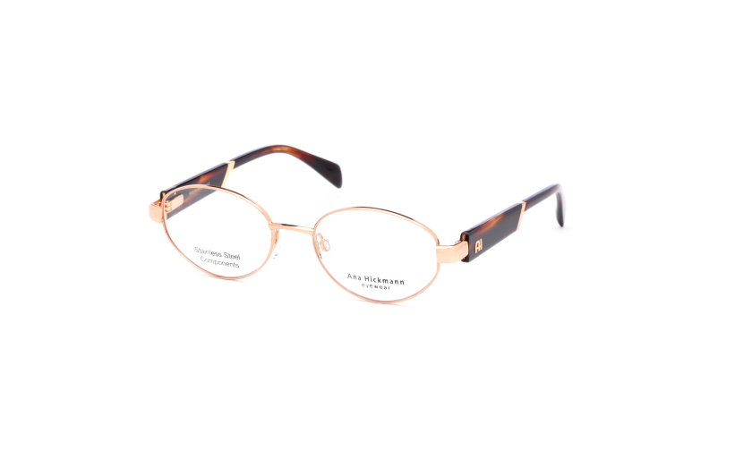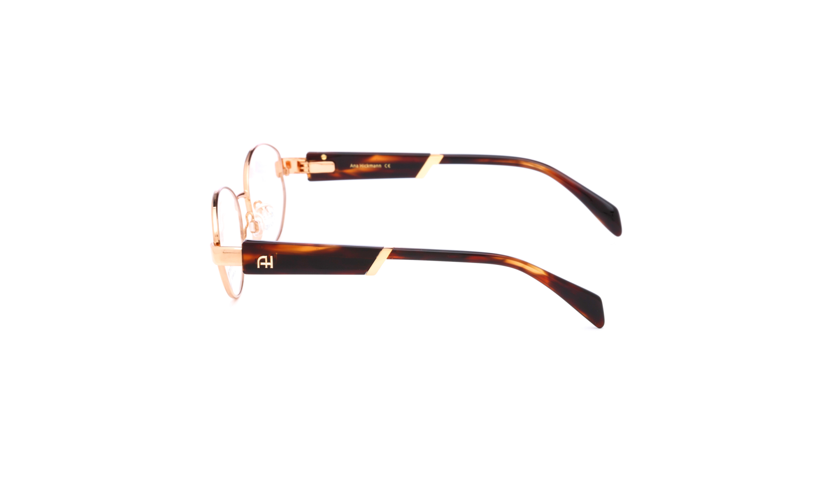 Modna i luksusowa oprawka okularowa ANA HICKMANN 1583 c.05A z owalnymi szkłami. Damskie okulary korekcyjne z szylkretowymi zausznikami i złotą ramką.