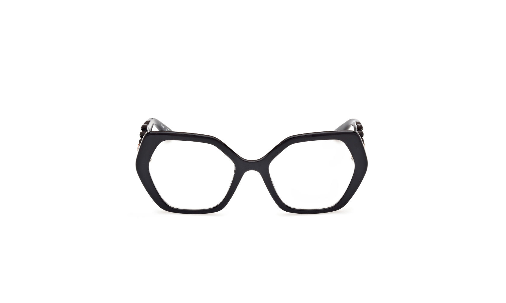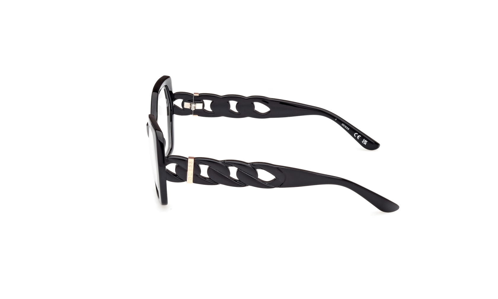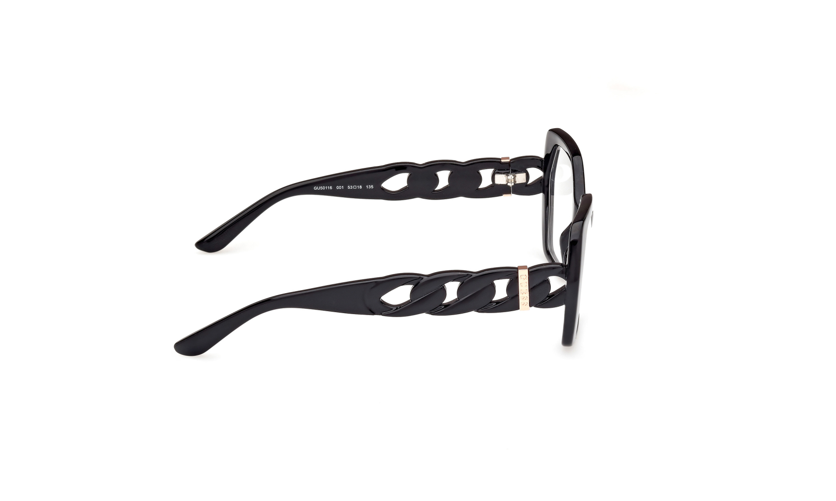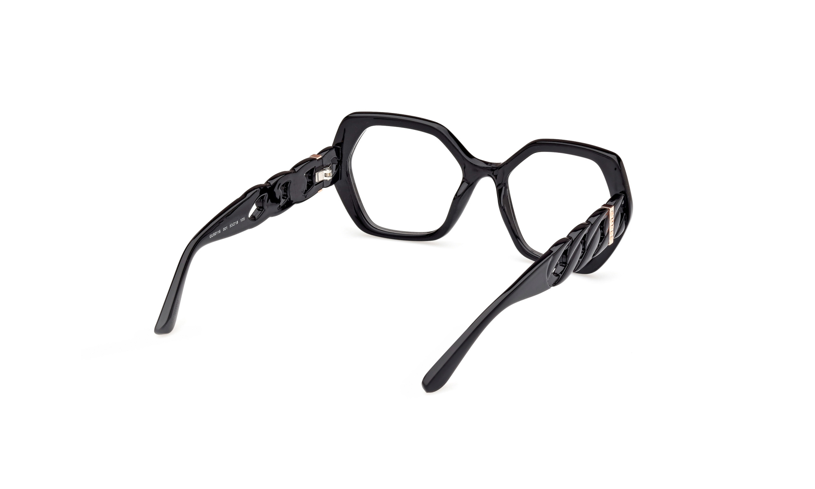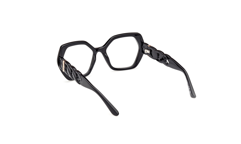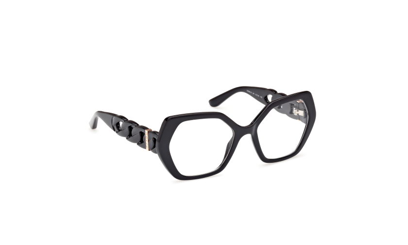 Oryginalna damska oprawka do okularów GUESS 50116 c.53001 wyróznia się nieregularnym fasonem i eleganckim stylem. To okulary korekcyjne z heksagonalnymi szkłami i ozdobnymi zausznikami w formie łańcucha. Luksusowa ramka okularowa w stylu glamour.