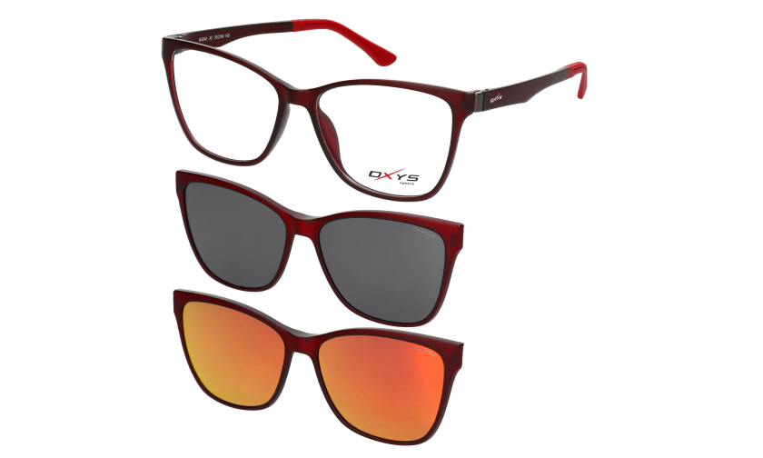 Damskie ciemnoczerwone oprawki OXYS Sphere KAMA XI o klasycznym kształcie, z 3 nakładkami przeciwsłonecznymi w zestawie.