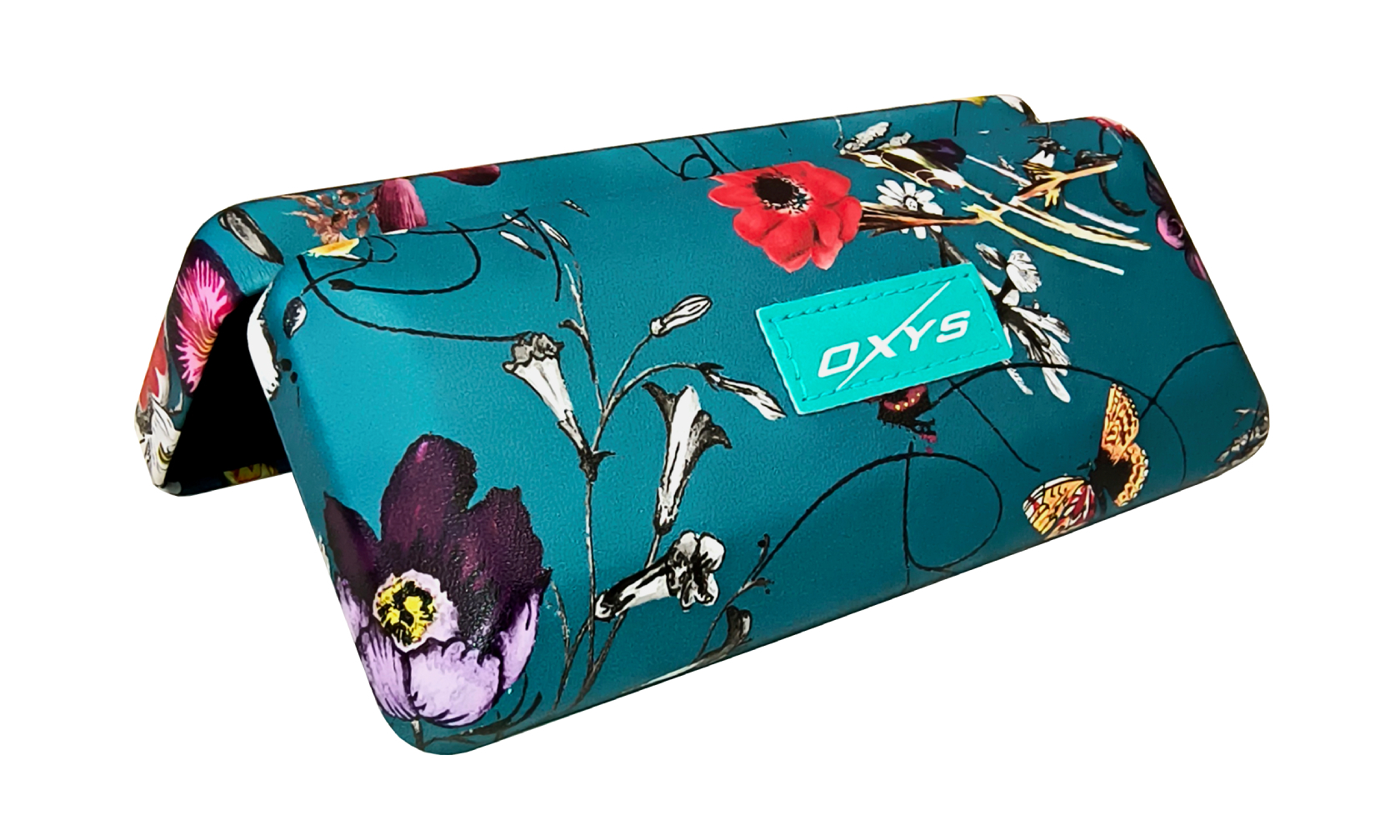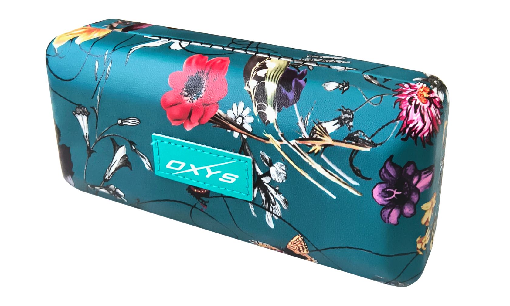 Eleganckie etui na okulary Oxys w kwiatowy wzór ma twardą konstrukcję o klasycznym prostokątnym kształcie. Wnętrze z czarnego aksamitu zabezpiecza soczewki przed zarysowaniami.
