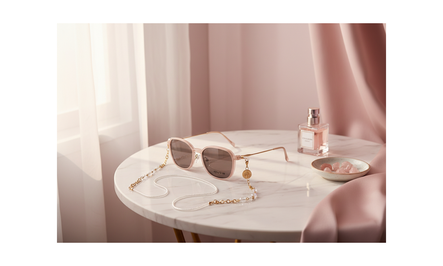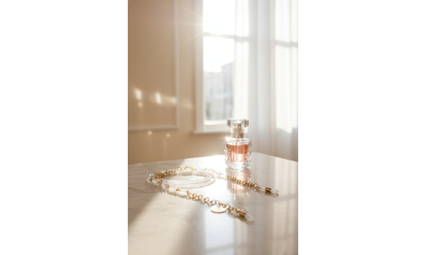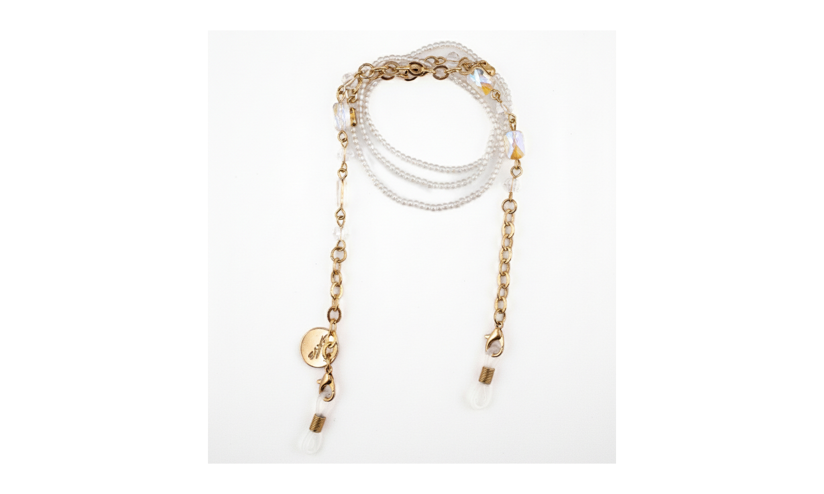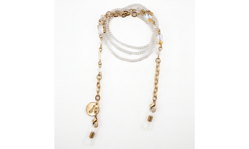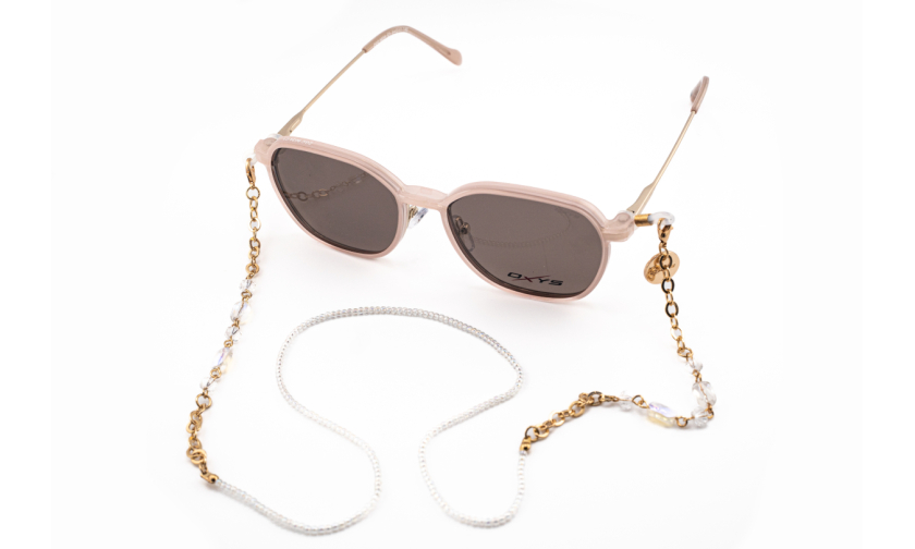 Model C157 wyróżnia się biżuteryjnym charakterem. Przednia część łańcuszka (o długości 17 cm) została wykonana ze splotu typu ankier w kolorze złotym. Drobne, lśniące ogniwa nadają całości elegancji i lekkości, a dodatkowo zostały ozdobione kryształowymi koralikami, które pięknie odbijają światło i subtelnie podkreślają stylizację. Pozostała część łańcuszka to delikatne białe koraliki o opalizującym wykończeniu, które wprowadzają nutę subtelności i klasy. Połączenie złotych elementów z bielą i przejrzystym połyskiem sprawia, że akcesorium świetnie komponuje się z oprawkami w odcieniach pastelowych, białych oraz transparentnych.