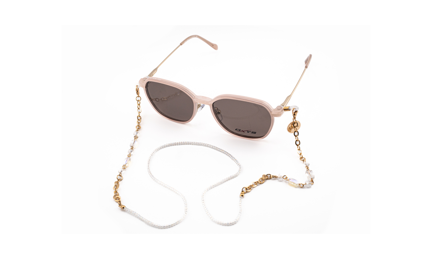 Subtelny i elegancki łańcuszek do okularów Oxys C157 jest lekki i uniwersalny. Składa się ze złotego łańcuszka i drobnych koralików, co tworzy piękną, biżuteryjną kompozycję. Pasuje do okularów korekcyjnych, przeciwsłonecznych i okularów do czytania.