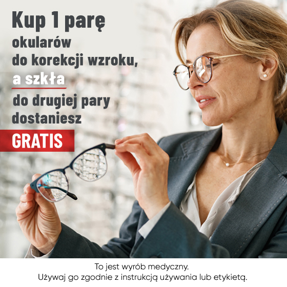 - Kup 1 parę okularów do korekcji wzroku (oprawy + szkła + montaż), a szkła do drugiej pary dostaniesz GRATIS*