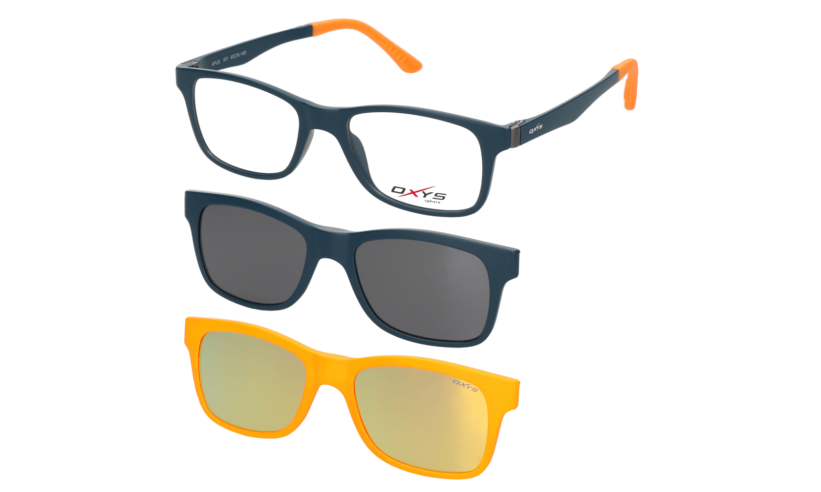 Wielofunkcyjna oprawka okularowa OXYS Sphere APUS XIV wyposażona w zestaw przeciwsłonecznych nakładek. Dziecięce okulary w małym rozmiarze z magnetycznymi nakładkami Clip-on.