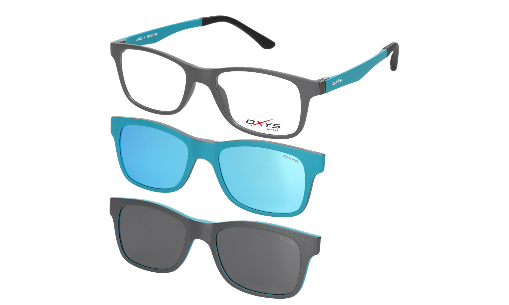 Wielofunkcyjna oprawka okularowa OXYS Sphere APUS X wyposażona w zestaw przeciwsłonecznych nakładek. Dziecięce okulary w małym rozmiarze z magnetycznymi nakładkami Clip-on.