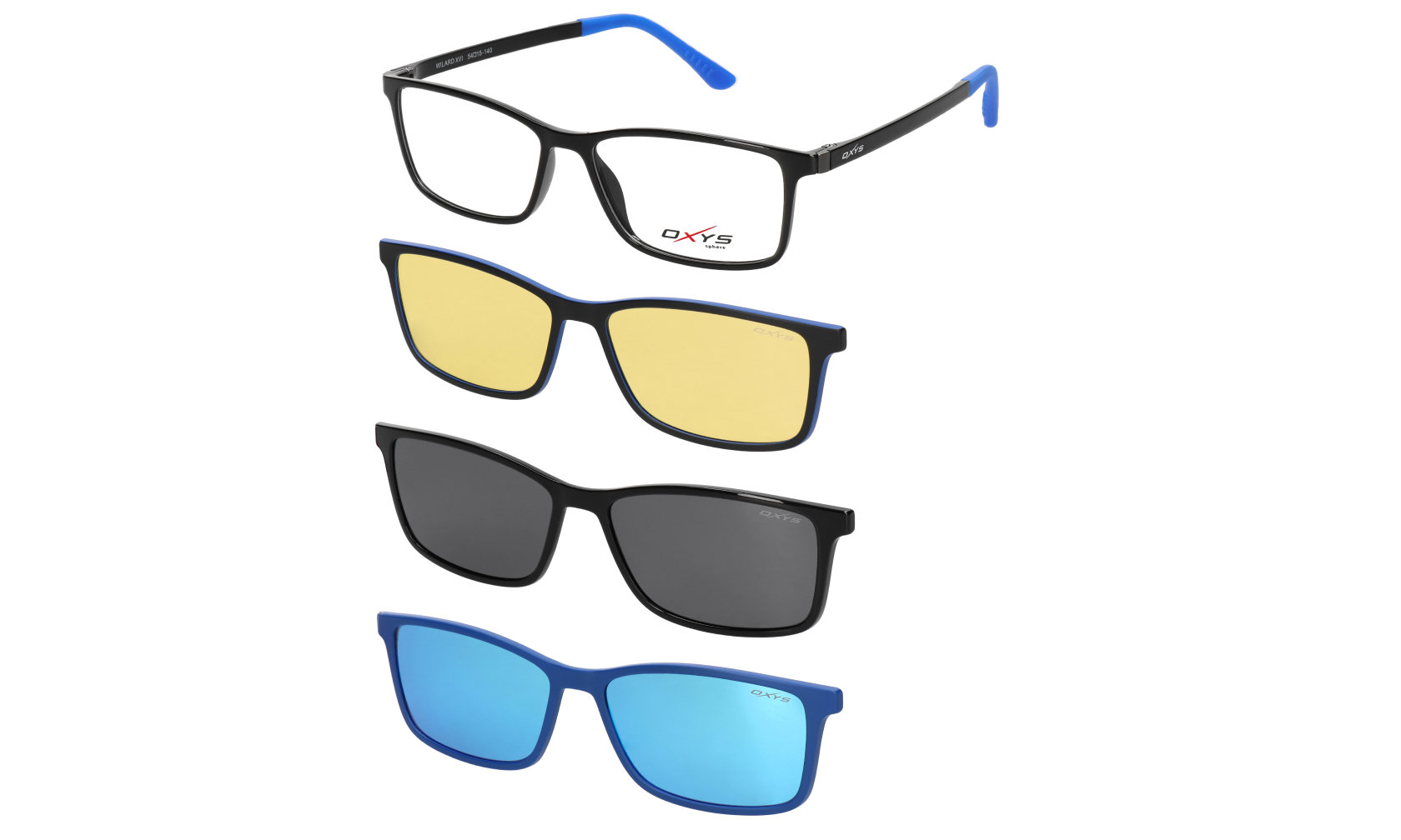 Oprawka korekcyjna OXYS Sphere WILARD XV – wielofunkcyjne okulary męskie z nakładkami przeciwsłonecznymi clip-on, kolor: czarno-niebieski.