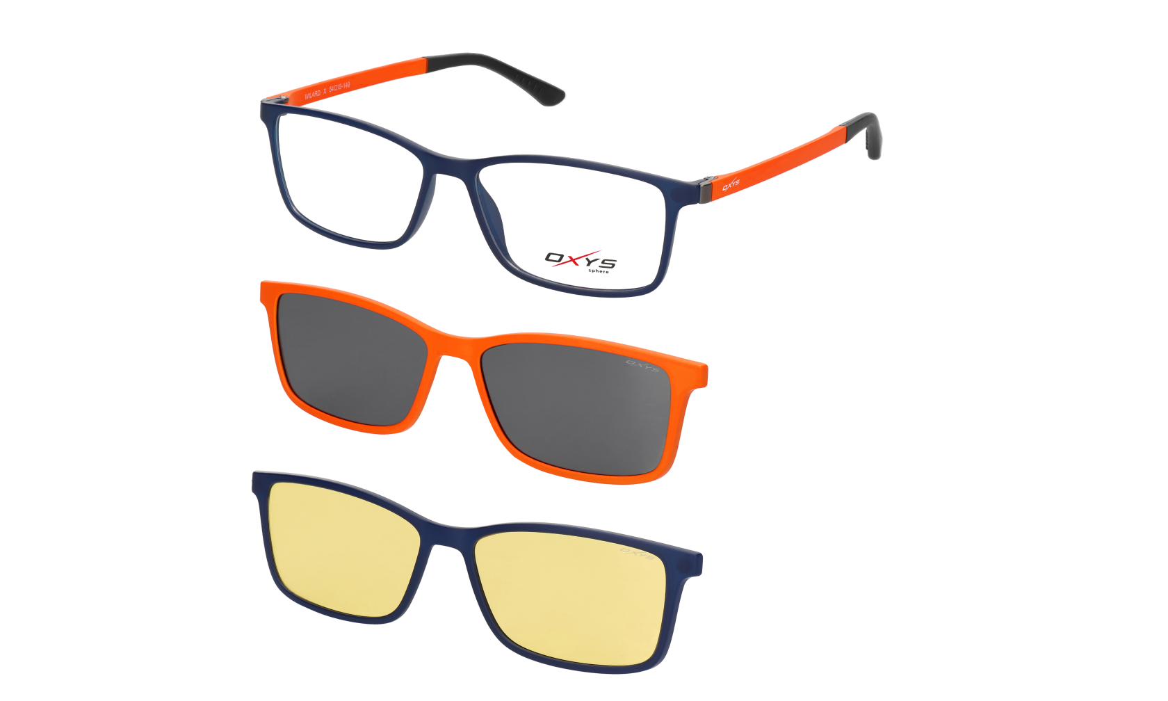 Oprawka korekcyjna OXYS Sphere WILARD X – wielofunkcyjne okulary męskie z nakładkami przeciwsłonecznymi clip-on, kolor: granatowo-pomarańczowy.