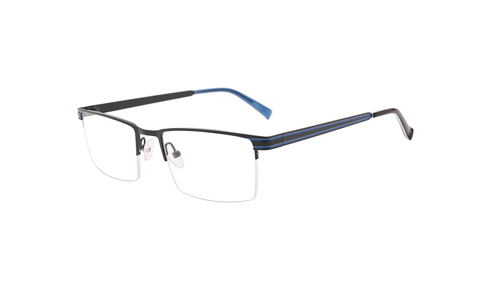 Czarna kolorystyka została uzupełniona o subtelne niebieskie akcenty, które nadają oprawkom oryginalności i świeżości, nie zaburzając przy tym ich minimalistycznego stylu. Metaliczne wykończenie podkreśla nowoczesny charakter okularów i dodaje im elegancji, sprawiając, że doskonale wpisują się w aktualne trendy. Kwadratowe okulary korekcyjne męskie w takiej odsłonie to idealne rozwiązanie dla mężczyzn, którzy chcą podkreślić swój indywidualny styl, zachowując jednocześnie profesjonalny i stonowany wygląd.