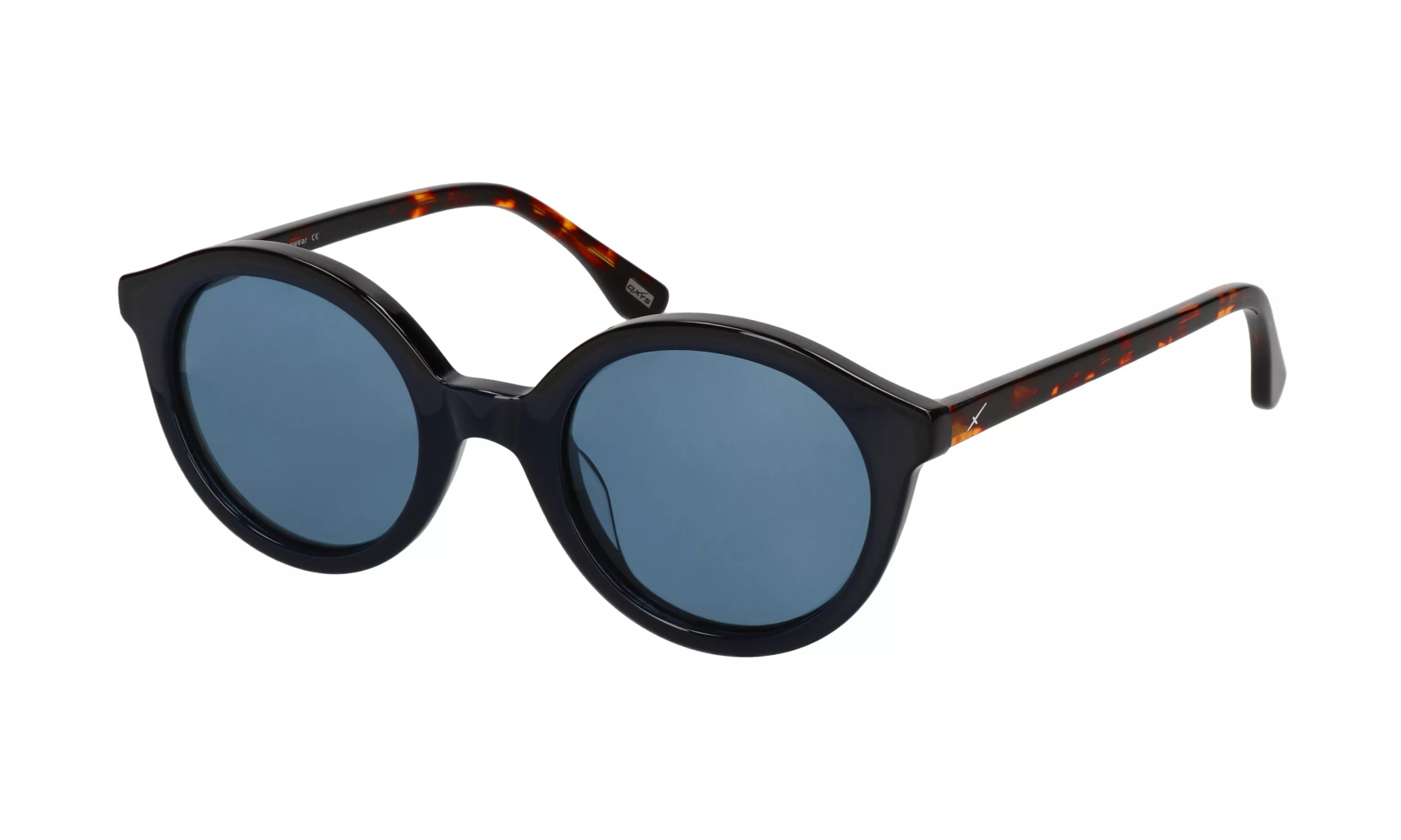 Stylowe okulary przeciwsłoneczne OXYS Sun-009 c.2 z granatowym frontem i szylkretowymi zausznikami. Okrągłe soczewki mają polaryzację oraz filtry chroniące przed UV.