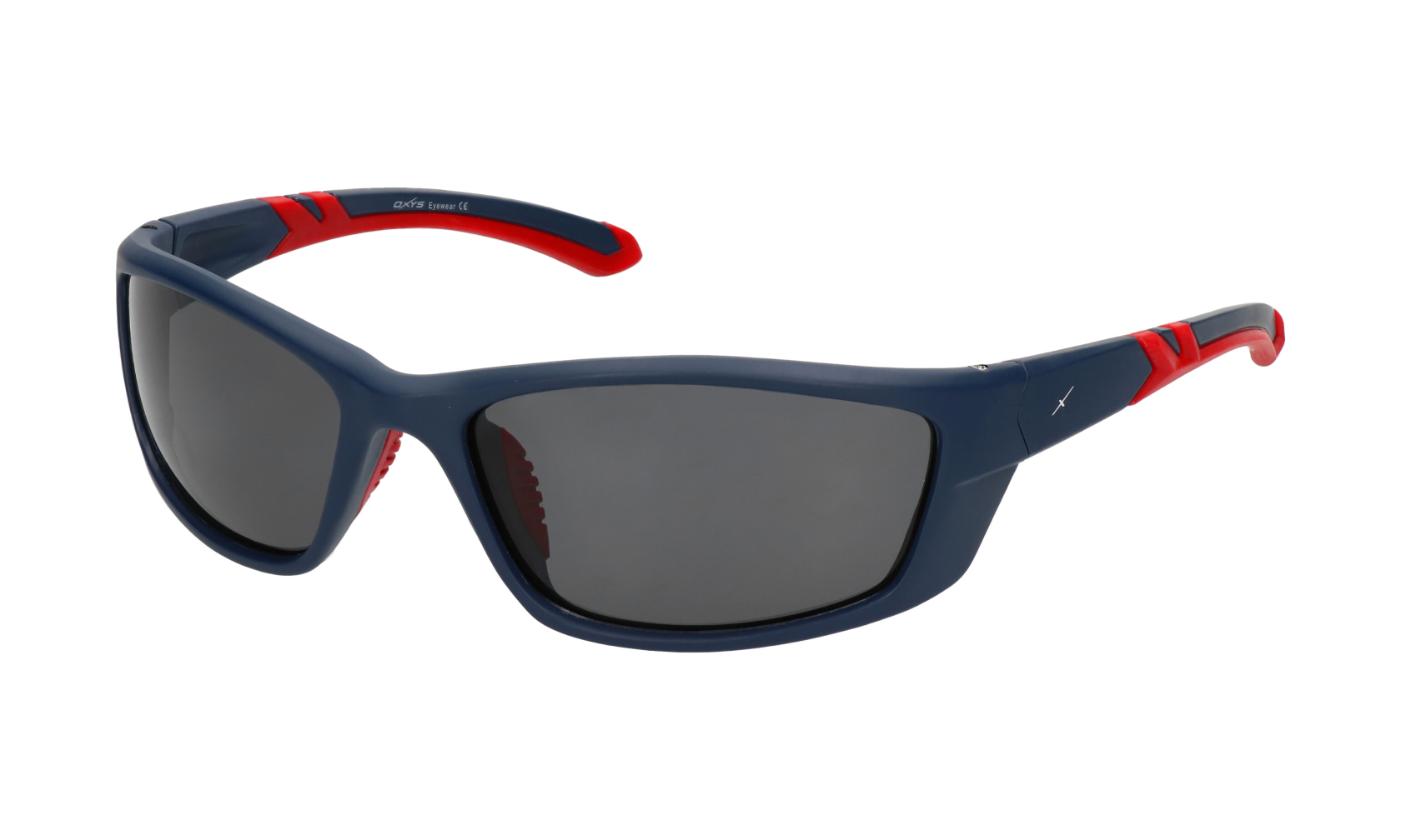 OXYS Sun-007 c.4 – doskonałe męskie okulary przeciwsłoneczne z polaryzacją w sportowym stylu, kolor: granatowy z czerwonymi detalami.