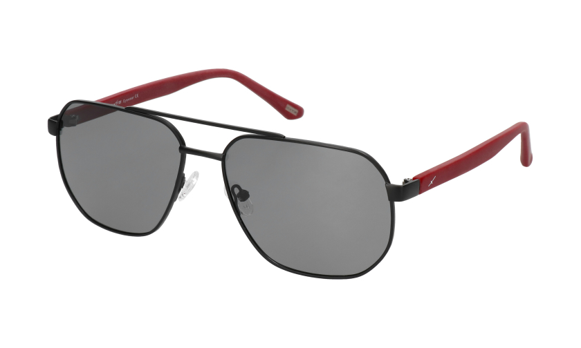 OXYS Sun-006 c.2 – Klasyczne okulary przeciwsłoneczne awiator w nowoczesnym wydaniu, kolor: czarny z czarnymi szkłami i czerwonymi zausznikami.