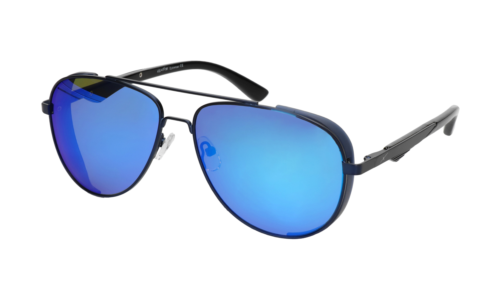 OXYS Sun-005 c.4 – męskie okulary przeciwsłoneczne w stylu awiator. Czarna metalowa oprawka, lustrzane niebieskie soczewki z polaryzacją i filtrem UV – klasyka w modnym retro wydaniu.