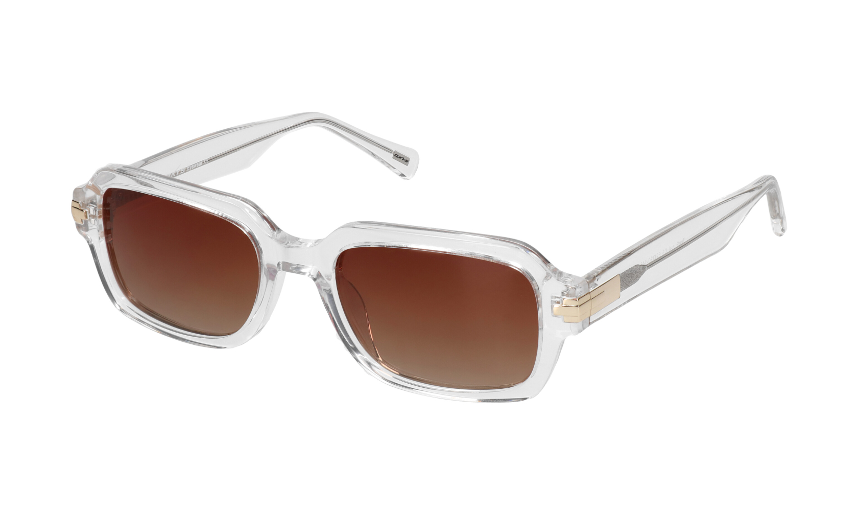 Modne damskie okulary przeciwsłoneczne OXYS Sun-004 c.3 z przezroczystą oprawką i brązowymi szkłami. Złote detale, polaryzacja i filtr UV to idealne połączenie elegancji i funkcjonalności.