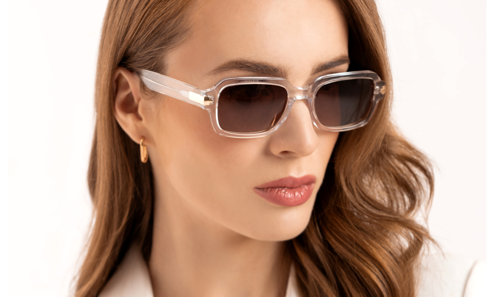 Okulary charakteryzują się prostokątnym kształtem, który dodaje im nowoczesnego charakteru, pasując do wielu kształtów twarzy. Bezbarwna oprawka z transparentnego tworzywa sztucznego nadaje okularom wyjątkowego uroku, a subtelne złote detale dopełniają całość, wprowadzając elegancki akcent. Dzięki przezroczystości, okulary zyskują luksusowy wygląd, który wyróżnia je spośród innych modeli na rynku.