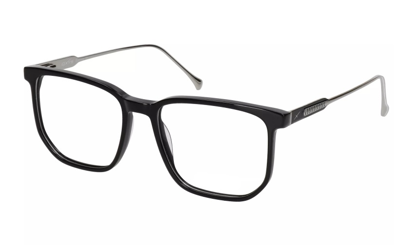 Duża oprawa korekcyjna OXYS TP 5025 c.1 z czarnym frontem i metalowymi zausznikami. Szkła o kwadratowym kształcie i klasyczna kolorystyka, tworzą okulary w bardzo uniwersalnym stylu.