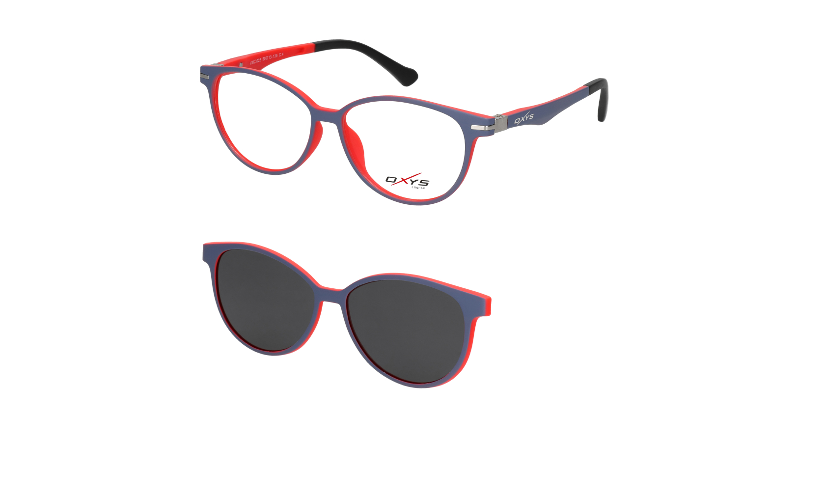 Małe oprawki okularowe dla dziecka OXYS VXC 3023 c.4 z praktyczną nakładką przeciwsłoneczną, kolor: granatowo-czerwony.
