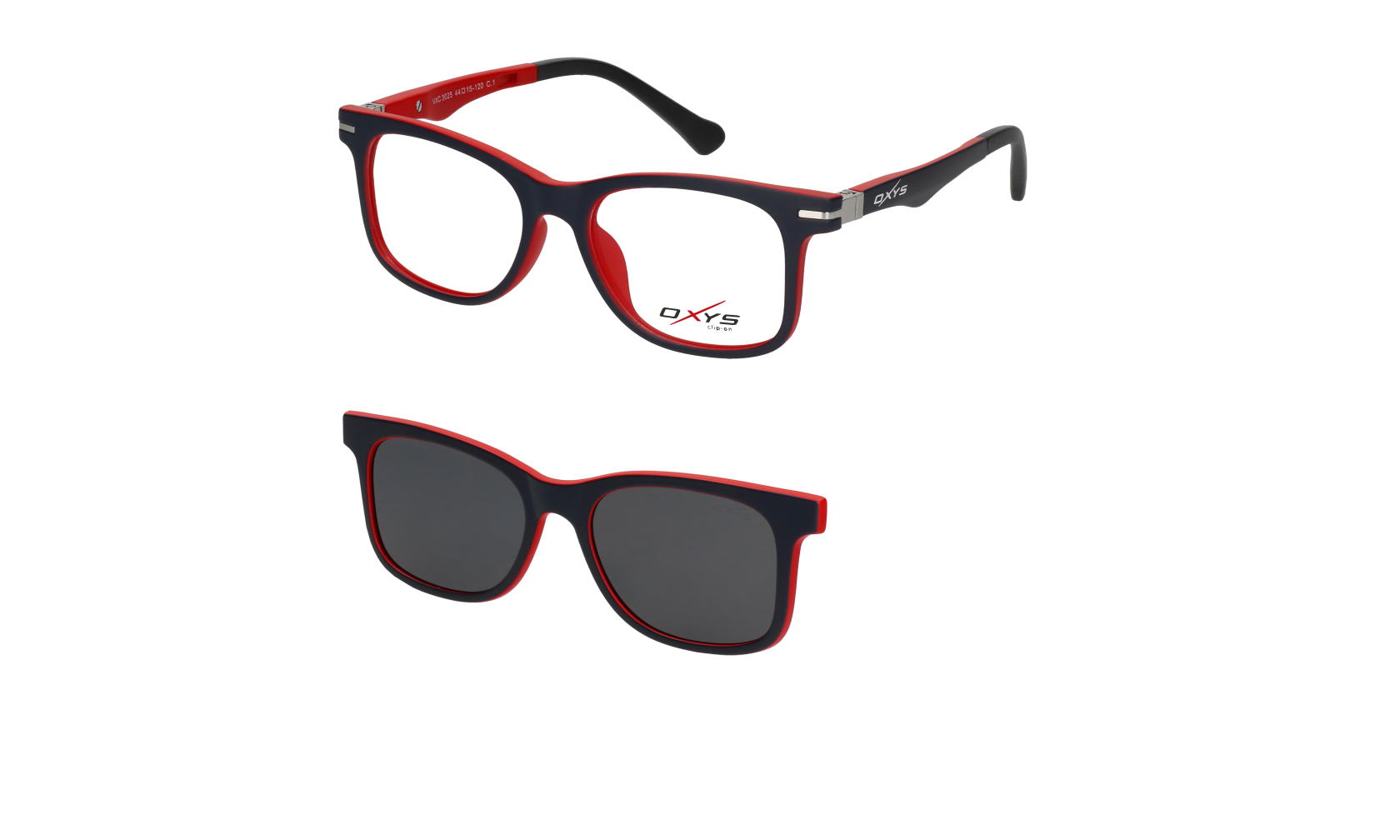 Dziecięca oprawka korekcyjna OXYS VXC 3025 c.1 z prostokątnymi szkłami i nakładką przeciwsłoneczną, kolor: granatowo-czerwony.