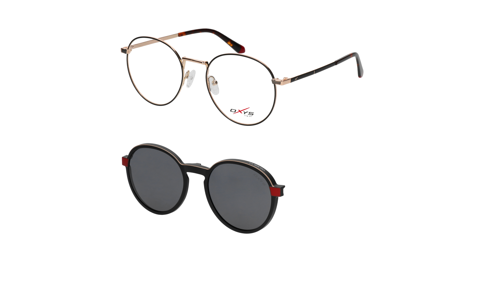 Okrągłe oprawki korekcyjne OXYS VXC 3030 c.2 z nakładka przeciwsłoneczną, uniwersalny model w kolorze złotym.