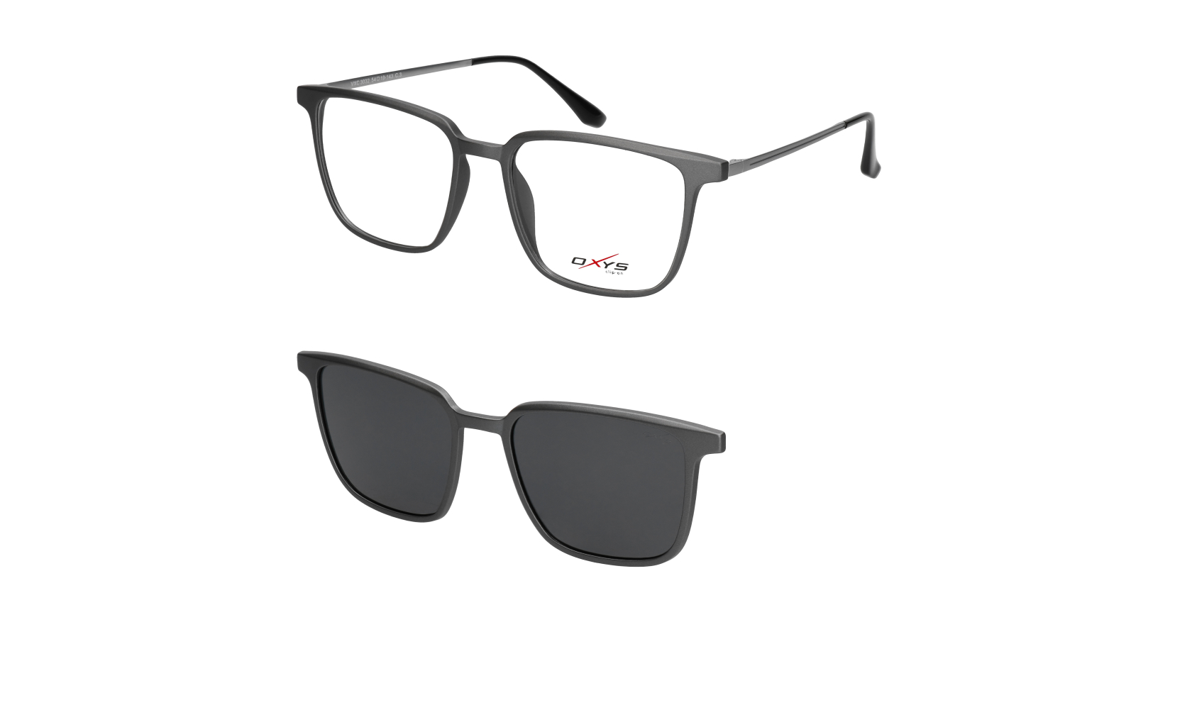 Męskie oprawy okularowe OXYS VXC 3032 c.3 w kolorze szarym, wyposażone w magnetyczną nakładkę przeciwsłoneczną z polaryzacją.