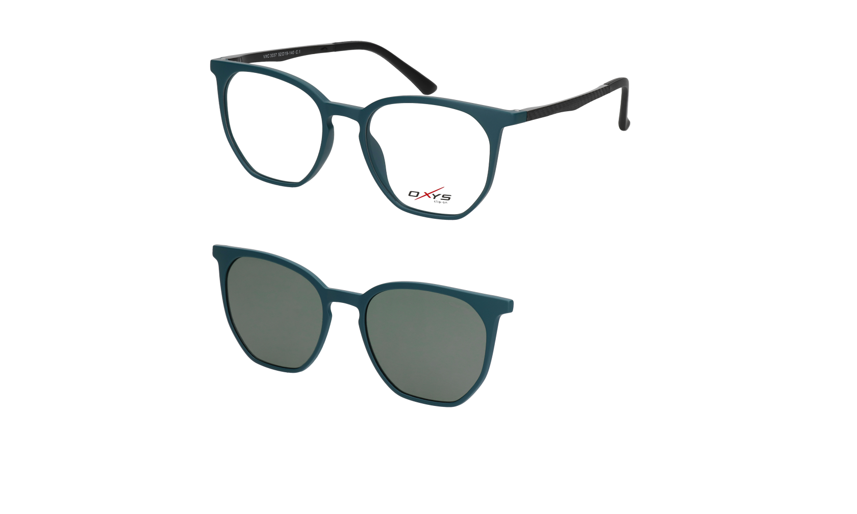 Oprawka korekcyjna OXYS VXC 3037 c.1 wyposażona w nakładkę przeciwsłoneczną z polaryzacją, kolor turkusowym.