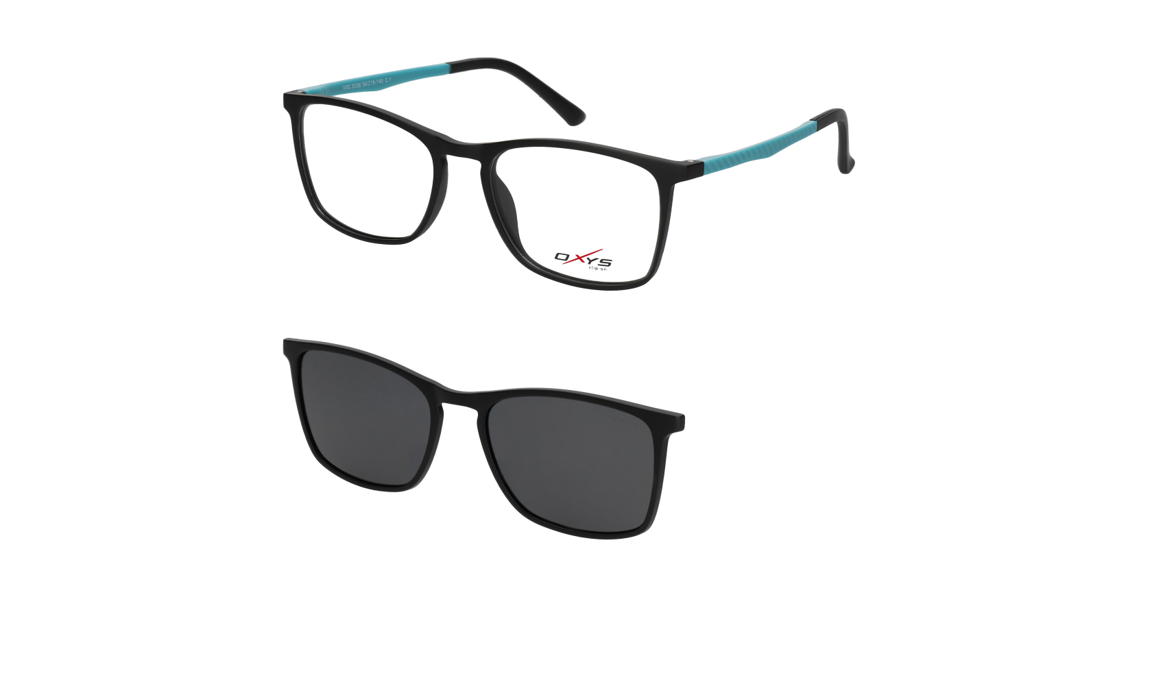 Męska oprawka okularowa OXYS VXC 3038 c.1 z nakładką przeciwsłoneczną clip-on, kolor czarno-niebieski.